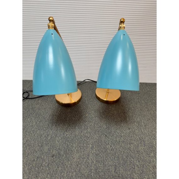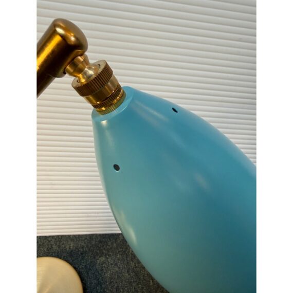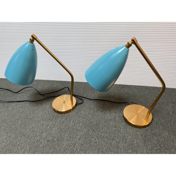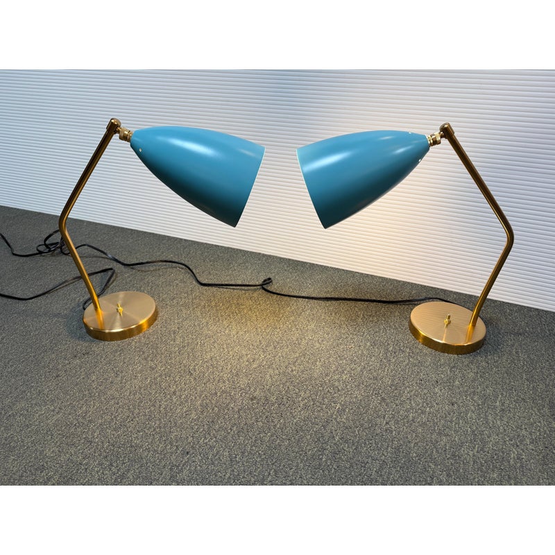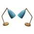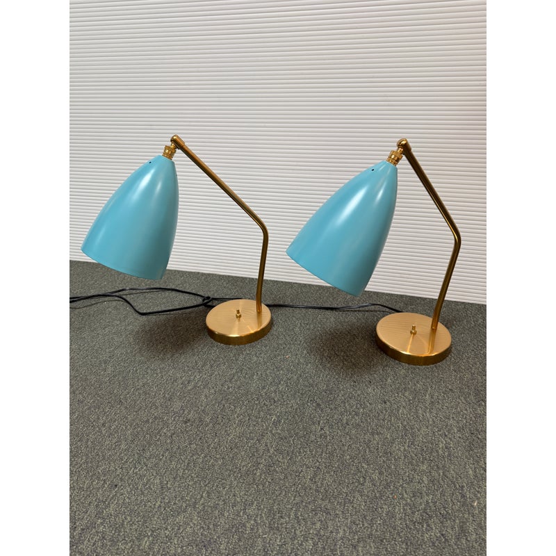 Design Plus Gallery presents a Pair of Grasshopper Table Lamps by Interior Icon. Get your 360 degrees of light with minimal glare as the shade can focus light in any direction. Playful with both a West Coast and European design style. Turquoise powder coat finish on metal with brass accent. Light evidence of wear; condition is consistent with age and use. Little wear; condition is good.