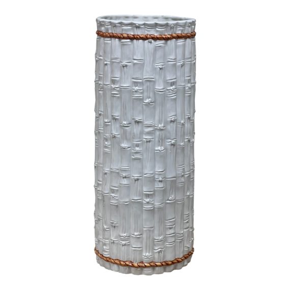Design Plus Gallery presents a Porcelain Umbrella Stand with a Faux Bamboo Finish Made for Gumps San Francisco, in Italy. The white porcelain finish takes the appearance of bamboo all bundled up together with two brown pieces of porcelain ‘twine’ holding the bushel together. Very sophisticated for your entry way. In good condition, with minimal evidence of surface wear.