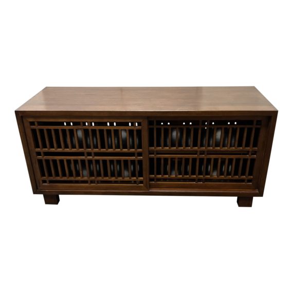 Design Plus Gallery presents a Gump’s Maria Yee Media Console. Maple wood frame is stained a dark chestnut tone and balances depth with the light and airy signature open trellis design Maria Yee incorporates into her pieces. The two doors slide on a track for a more efficient space flow. Back and front is optimized for ventilation and electrical cords. Minor wear through out, sideboard unit is in good condition.