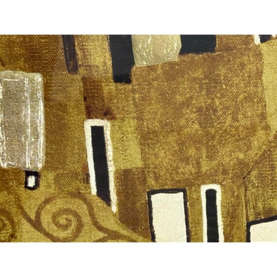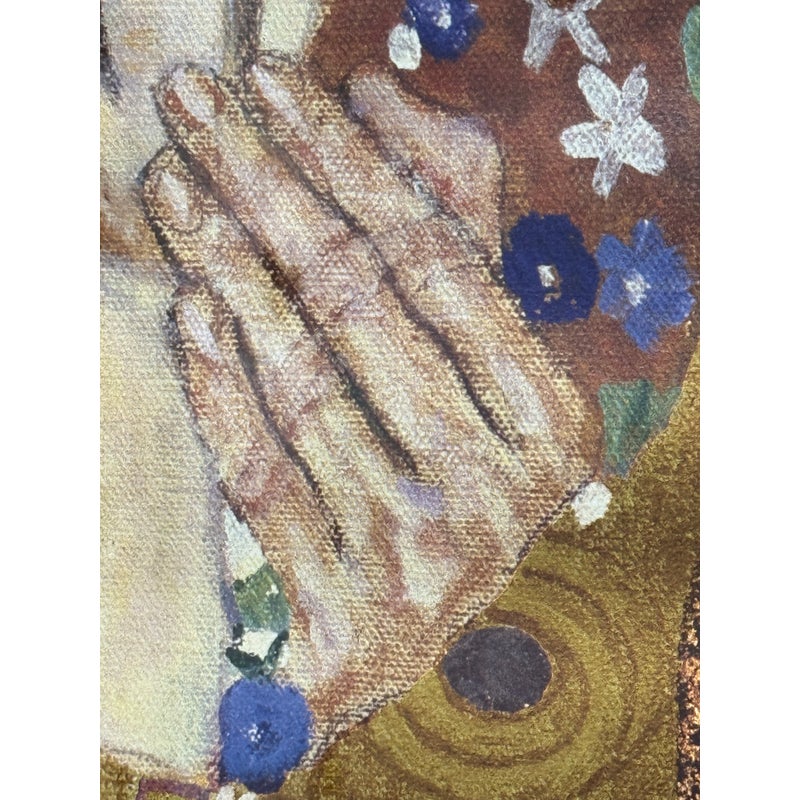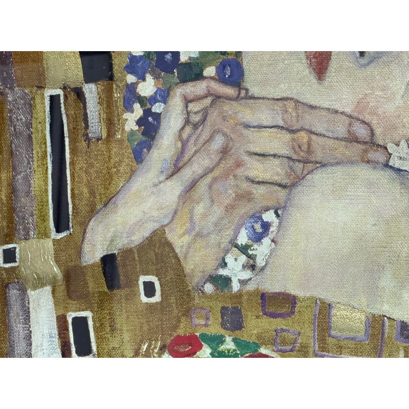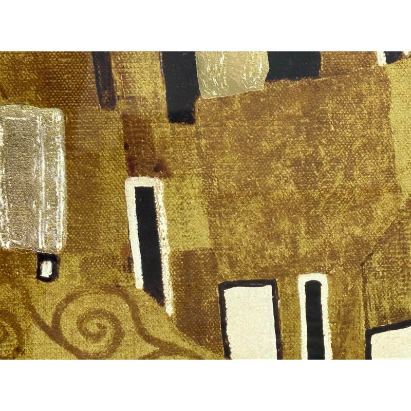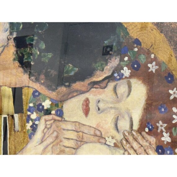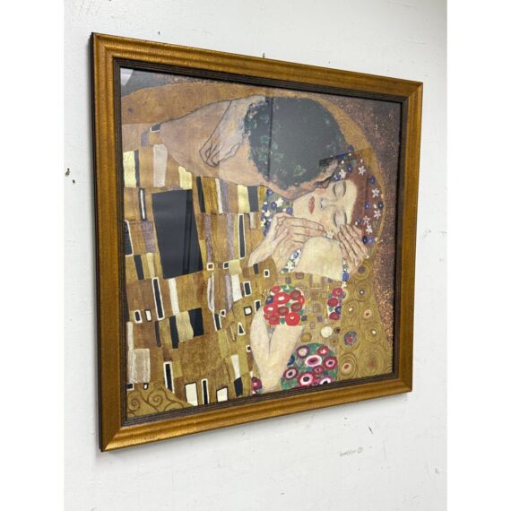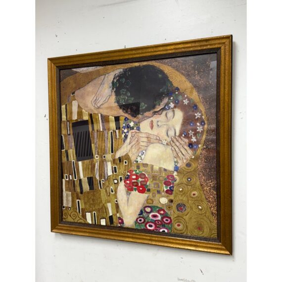 Design Plus Gallery presents a Custom Framed Print of “The Kiss” by Gustav Klimt. A large, gold-filled painting that evokes a sense of spiritual transcendence. The use of gold and patterns suggests Byzantine influences. The painting abstracts a universal experience, the kiss, from the anxieties of everyday life. The figures are crowned, symbolizing their heavenly status. The original painting is a significant example of Art Nouveau, with its characteristic undulating lines and decorative elements, and is considered a symbol of romance and love. Created between 1907 and 1908, it is housed in the Österreichische Galerie Belvedere in Vienna, Austria. In good condition, minimal wear from.
