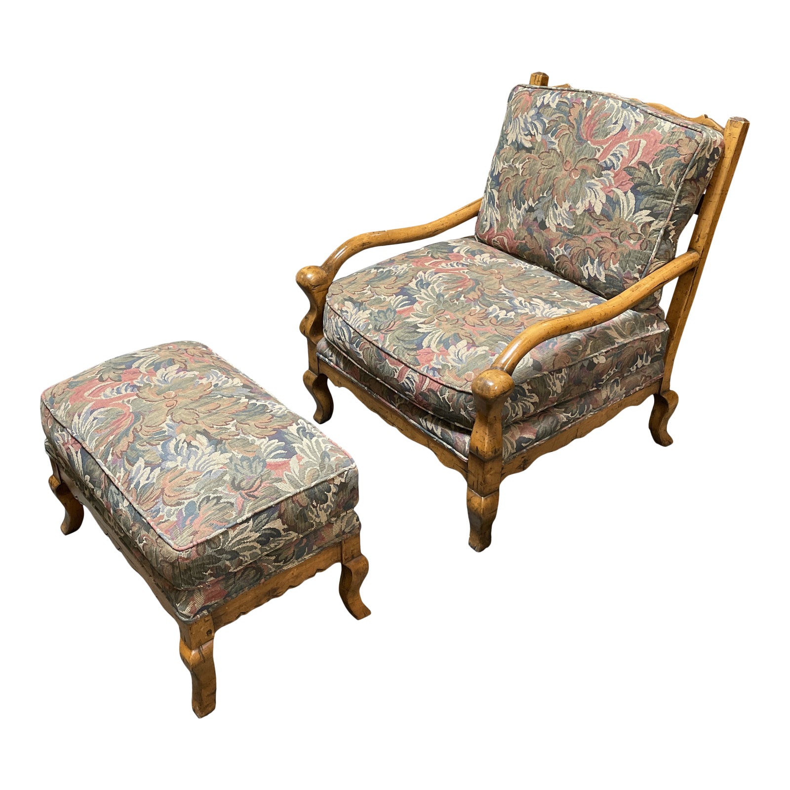 Design Plus Gallery presents a Country French Knuckle Lounge Chair + Ottoman by Guy Chaddock. The design model numbers are “UC3001” + “UC3002”. A practical and enticing set that brings gratification to any home. The design falls into the transitional category. The loose seat cushions are upholstered in a floral print. The frame is in a chestnut finish. Minor wear from usage. This is a discontinued design.