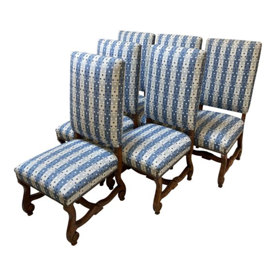Design Plus Consignment Gallery has a set of six Guy Chaddock Gainsboro Dining Chairs. A classic design, these chairs are upholstered. The classic chairs are solidly made in the Country English Mutton Bone Design, with a warm, distressed finish. Seats and back are upholstered in a dotted/stripe jacquard with large bronze nail head accent. Chaddock goals are simple yet bold: to design and manufacture home furnishings of style, elegance and American-made quality for discerning designers and shoppers throughout the world.