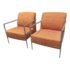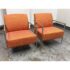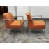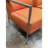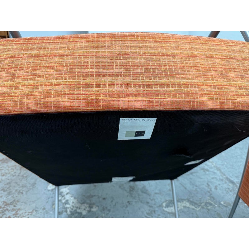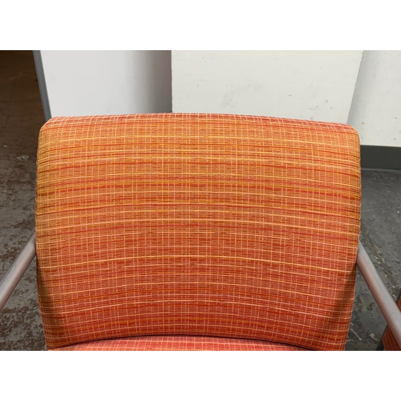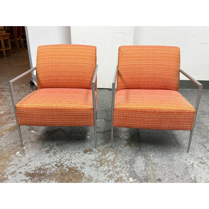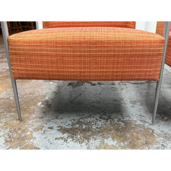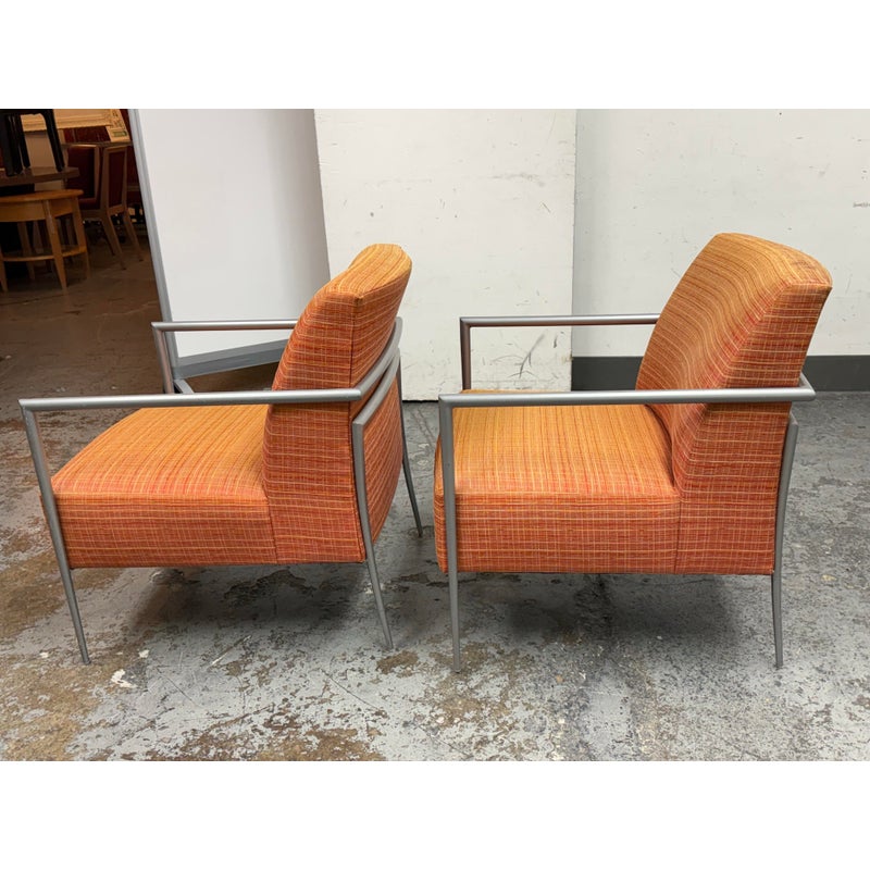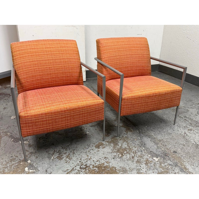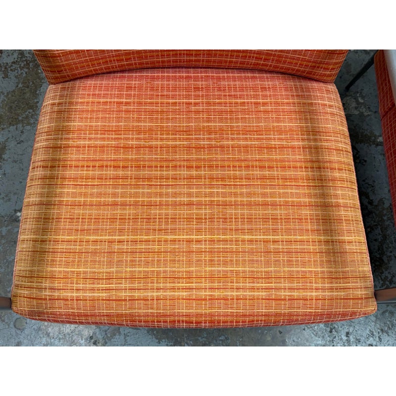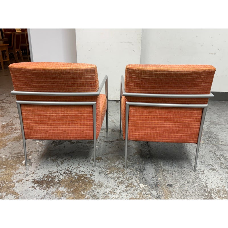 Design Plus Gallery presents a Pair of Orange Tween Lounge Chairs from HBF. The chairs have a retro look + feel while being made from premium upholstery and high quality metal. The are commercial weight and durable, heavy not going anywhere. They are both in good condition for their age with minimal surface wear for their use. Visible discoloration and fading due to sun exposure. Made in North Carolina, USA.