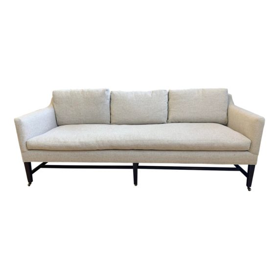 Design Plus Gallery presents a Hd Buttercup Sofa on Castors. Neutral upholstery has a varying warp and weft to give the feel of a soft linen. Bench cushion has a down filled seat for inviting lounging. Arms slope elegantly back for mid-back support and cradles three removable \back cushions. Espresso finished legs sit atop oiled brass castors for an old world feel and easy moving around. Little evidence of wear.