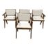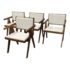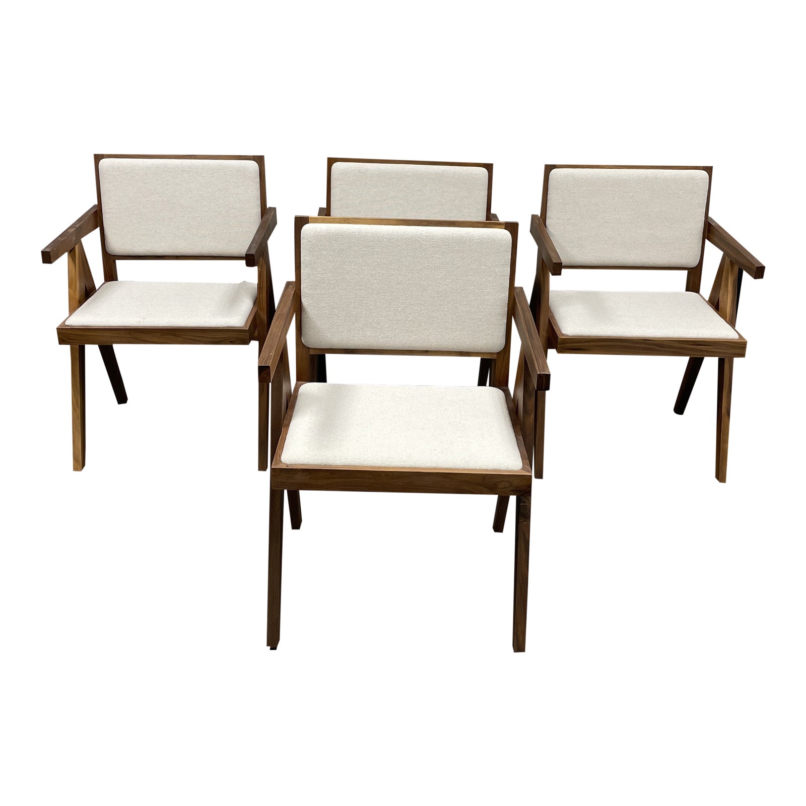 Design Plus Gallery presents a Set of Four H. D. Buttercup Upholstered Karazona & Veerle Cinar Prouve Style Arm Chairs. Wood veneer frame is a rich and welcoming walnut tone. Ivory upholstery sets off the dynamic and linear lines of the iconic silhouette inspired by Jean Prouve. Minor wear on some of the surfaces, good condition. Purchased at H.D Buttercup in San Francisco.