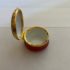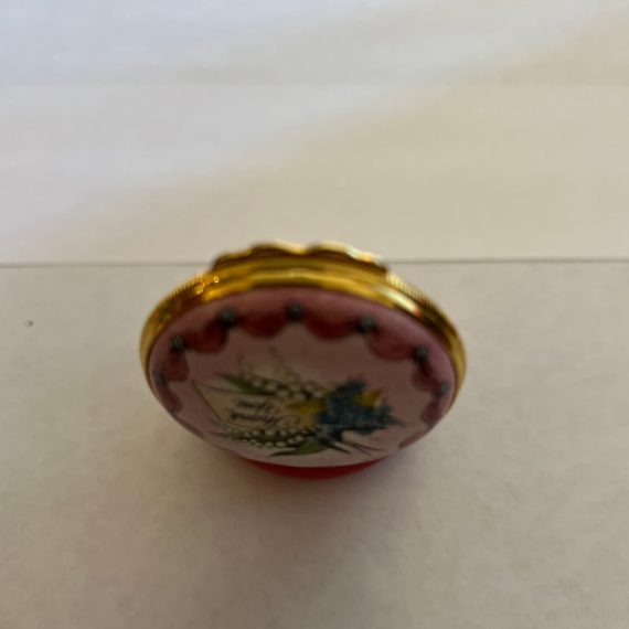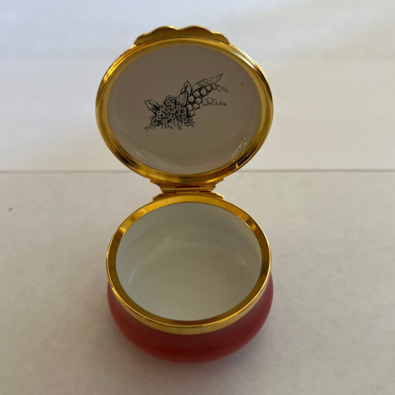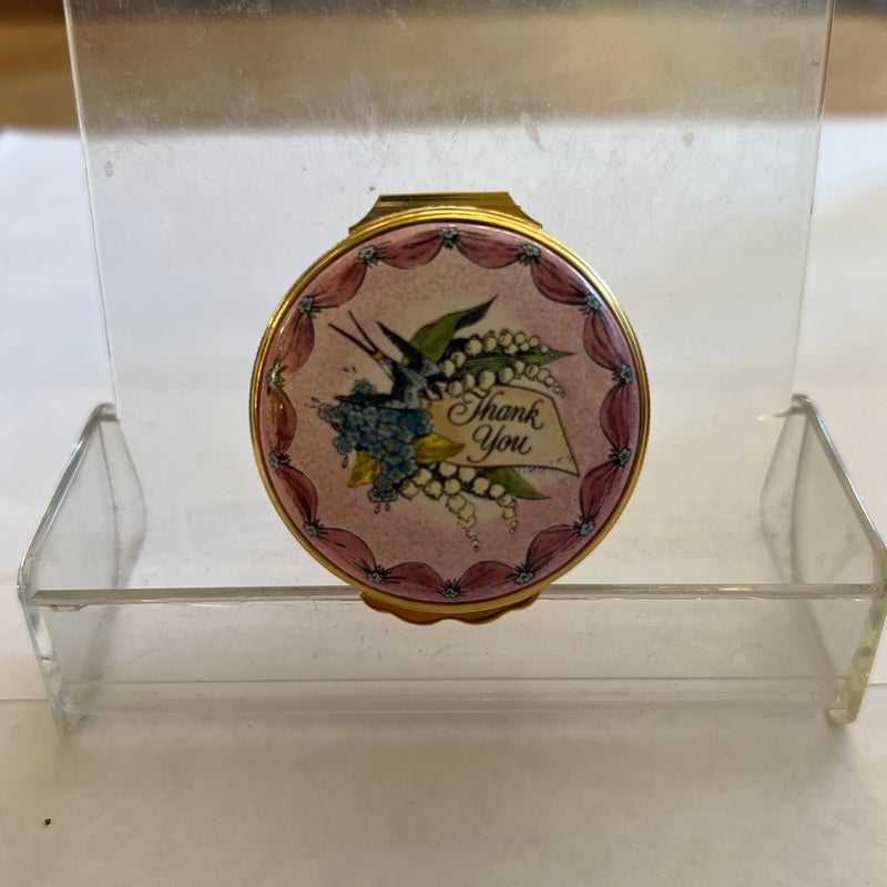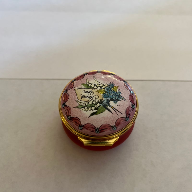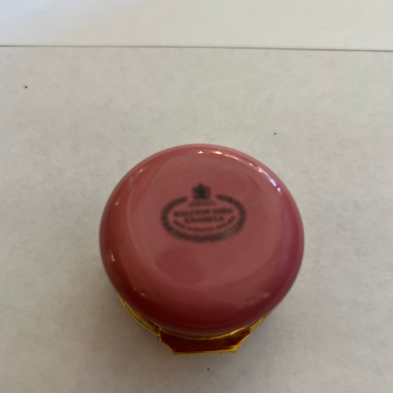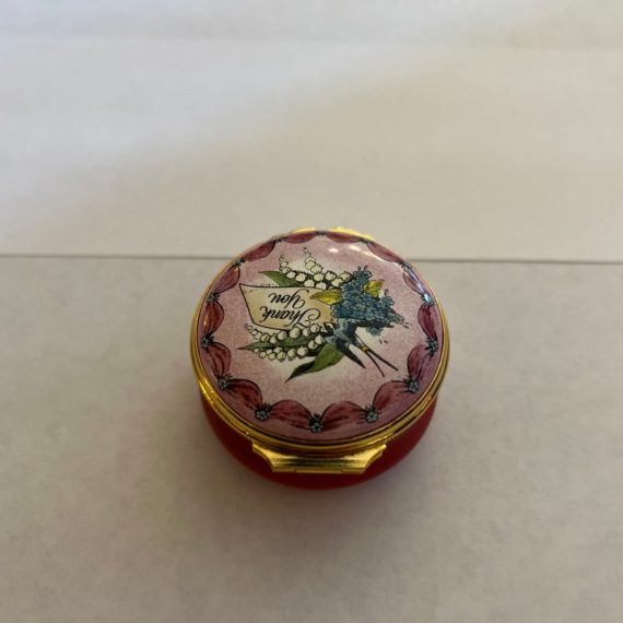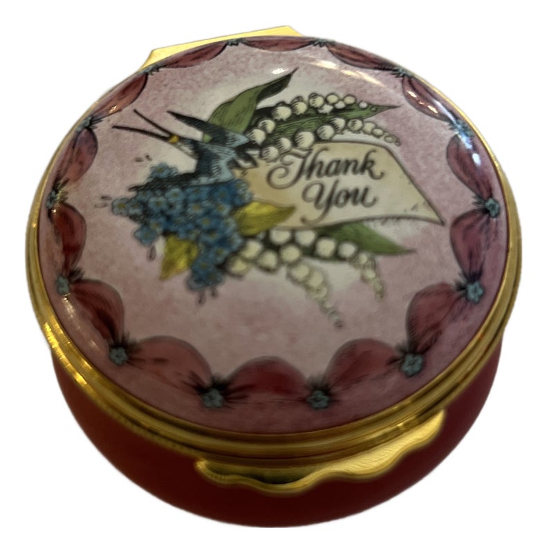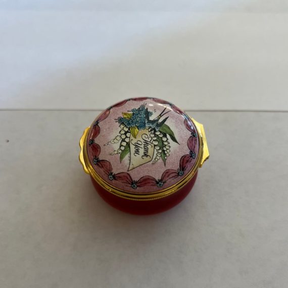 Design Plus Gallery presents a “Thank You” Rose Enamel Hinged Trinket Box from Halcyon Days Enamel. Halcyon Days is a luxury gift and accessories company that specializes in English craftsmanship. They are one of only 14 companies in the world to hold all three Royal Warrants to the British Royal Household. This hinged trinket box was enameled on copper in Bilston, England. This box’s design has a bouquet of flowers on a background of rose with the message of Thanks in script. Is in good condition with no chips or cracks present.