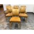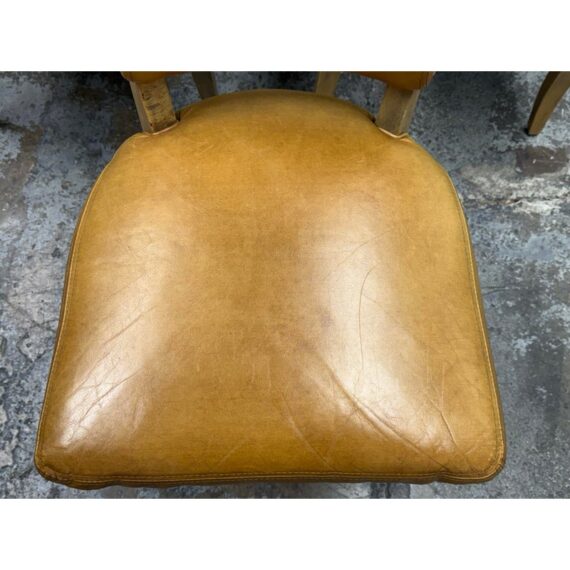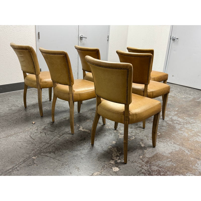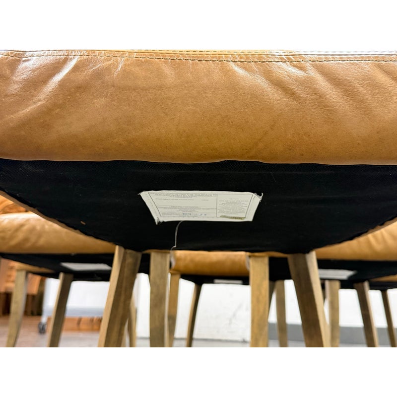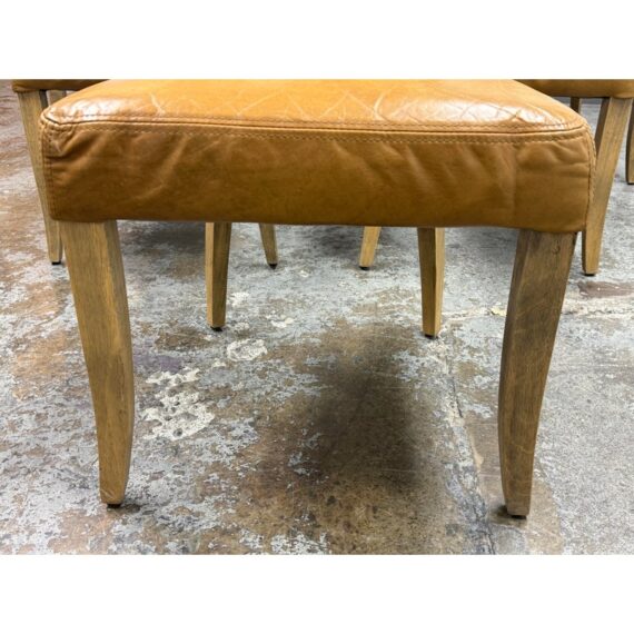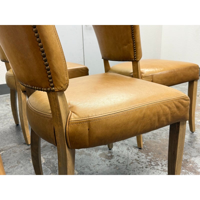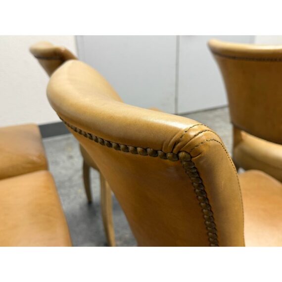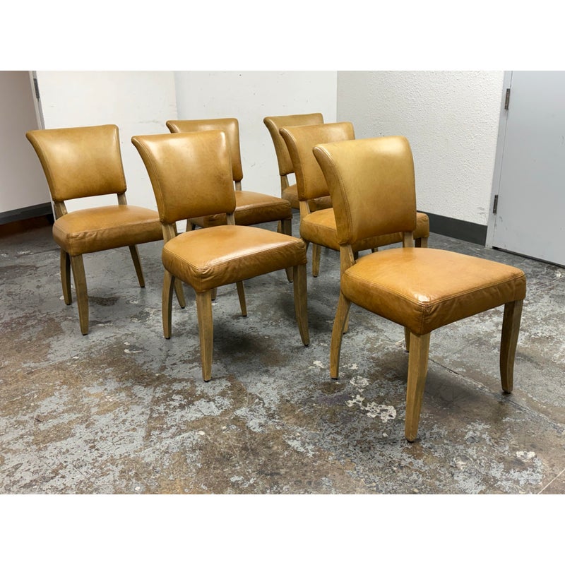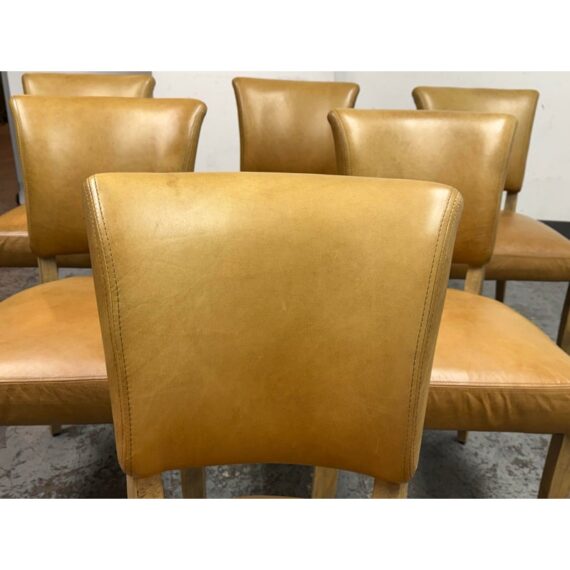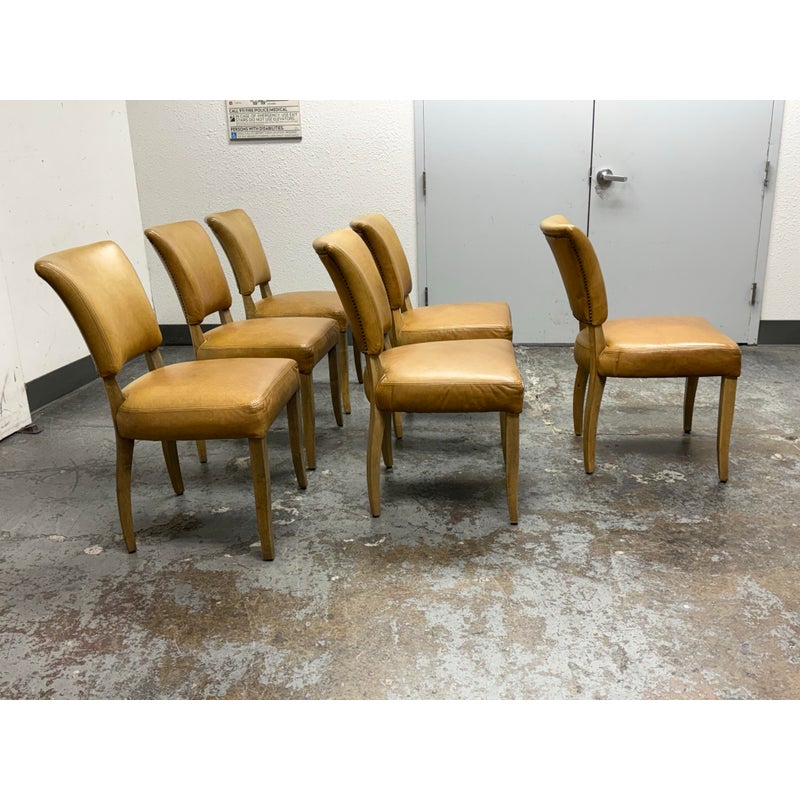 Design Plus Gallery presents a Set of Six Tan Leather Side Chairs from Halo Asia for Sunrise Home. The chairs are nicely padded with a rustic tone of tan leather over the seat and back frame. Exposed tan wood legs match the leather well, giving a monochrome appearance. They have visible scratches and wear to the leather that is naturally occurring with age. Some chairs have fading on back due to sun exposure. In good condition, visible and minimal wear form usage.