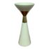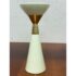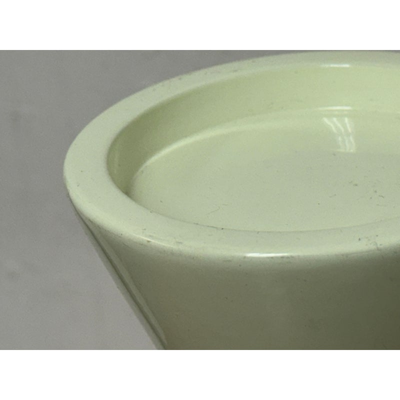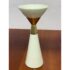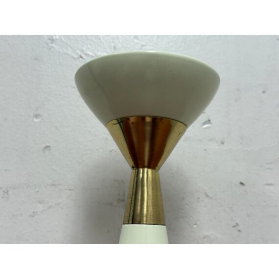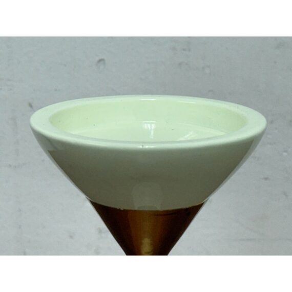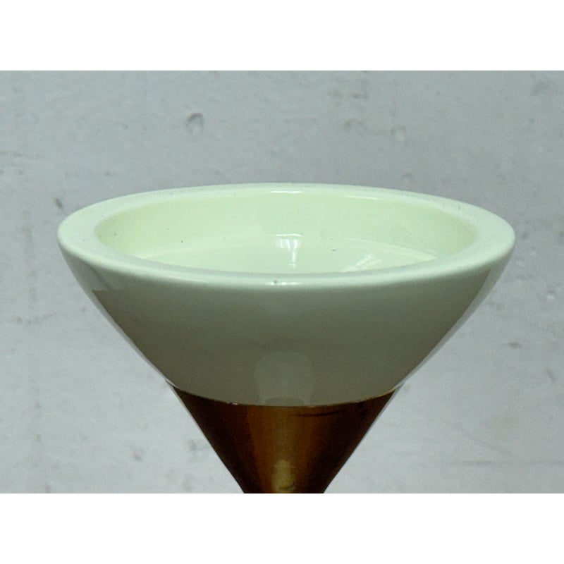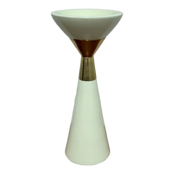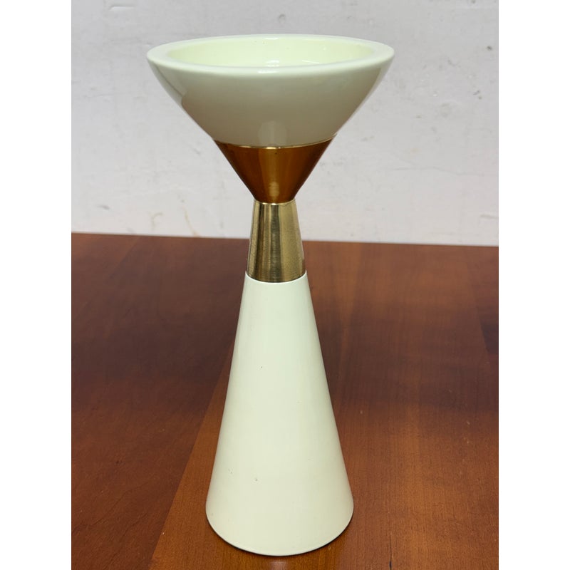 Design Plus Gallery presents the Hourglass Pillar Candle Holder by Hamilton Park Interiors. This compact candle holder features a sculptural profile, flared cup, tapered stem, and contrasting metallic detail. The ivory toned body is paired with brass toned accents that emphasize its geometric form and give the piece a distinct vintage inspired look. It is in good condition with visible and minimal wear from usage. Made in India.