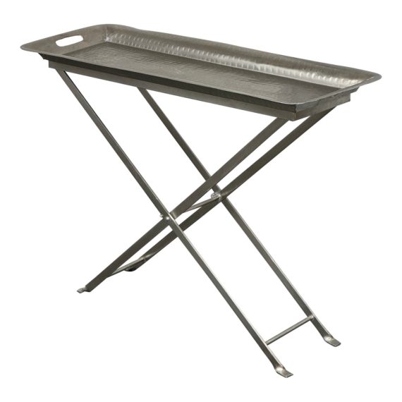 Design Plus Gallery presents a Nickel Finish Butlers Tray Table that is Collapsible. The long narrow metal tray has a lifted edge and hammered texture. The tray stand is a standard X shape and collapses easily. Is in good condition with surface wear that is consistent with its likely vintage age.