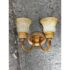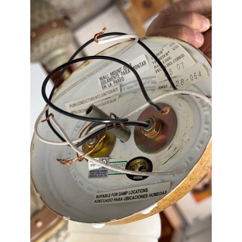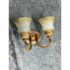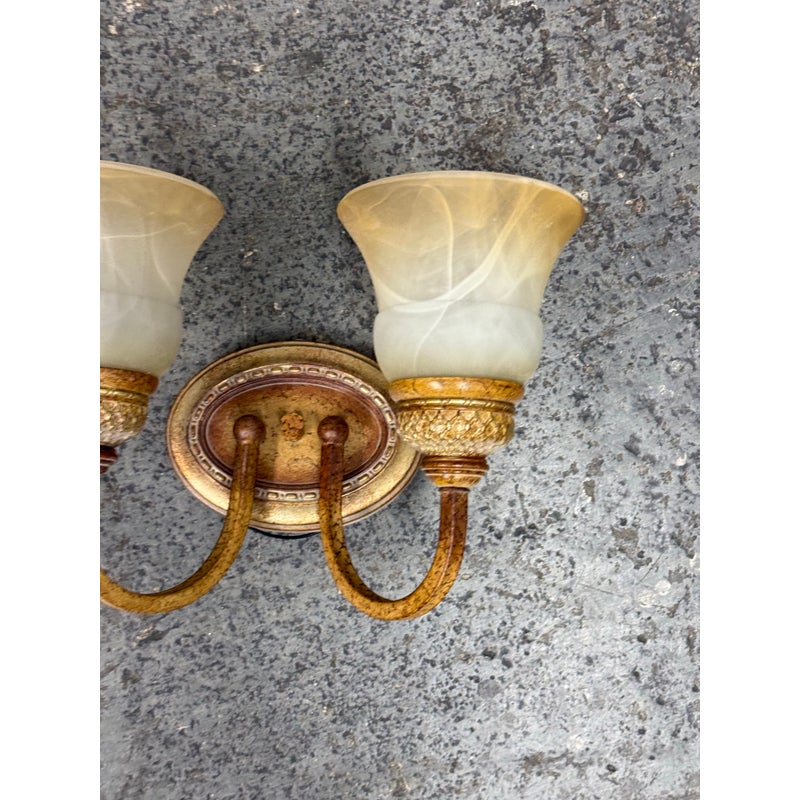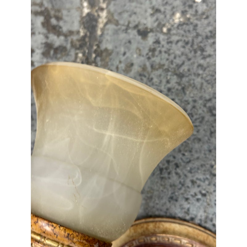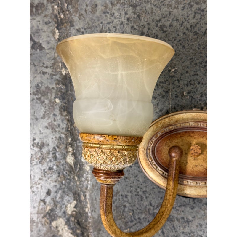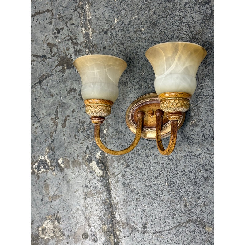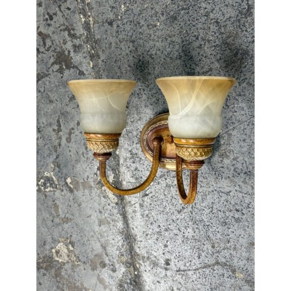 Design Plus Gallery presents a Dual Arm Alabaster Style + Brass Wall Sconce from Hampton Bay. The sconces has the look of old-world money with its tulip shaped glass bulbs that resemble alabaster with golden bronze finished hardware. The fixture is in good condition for its minimal usage.