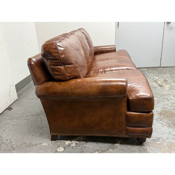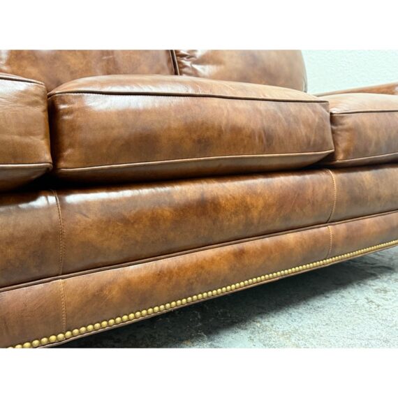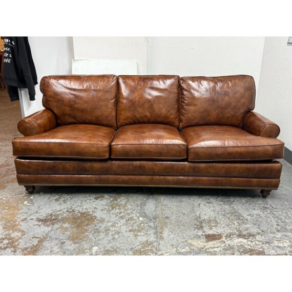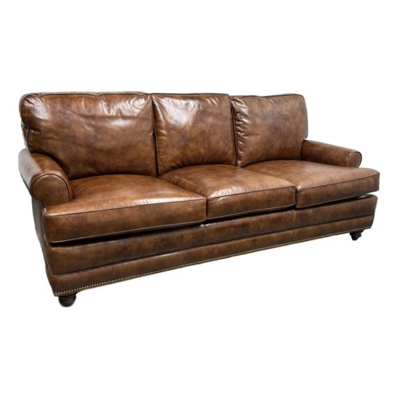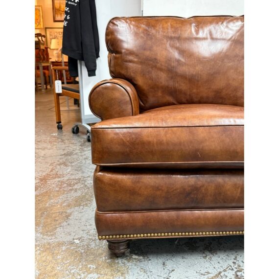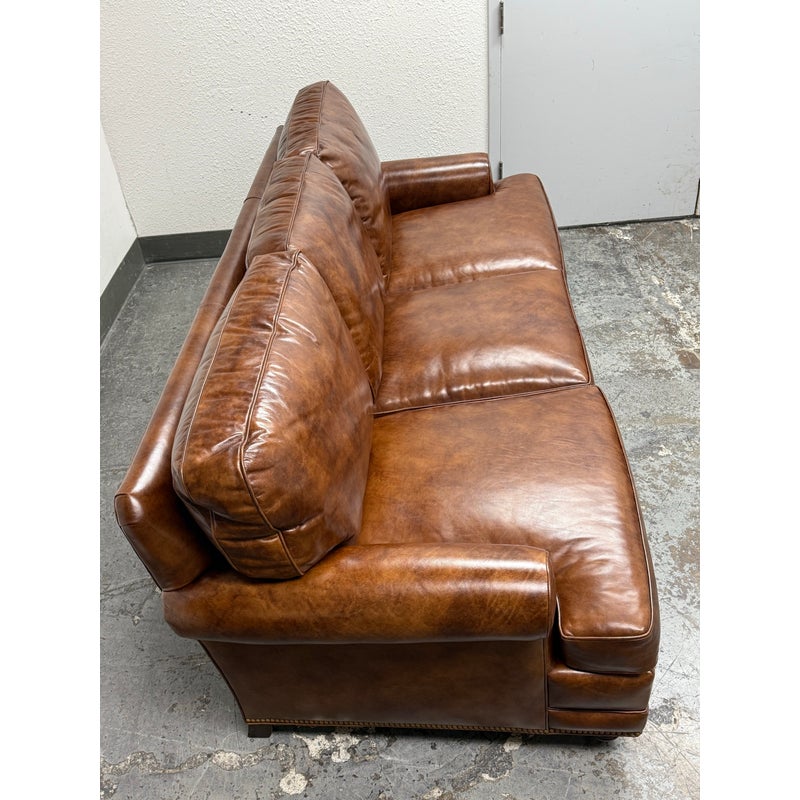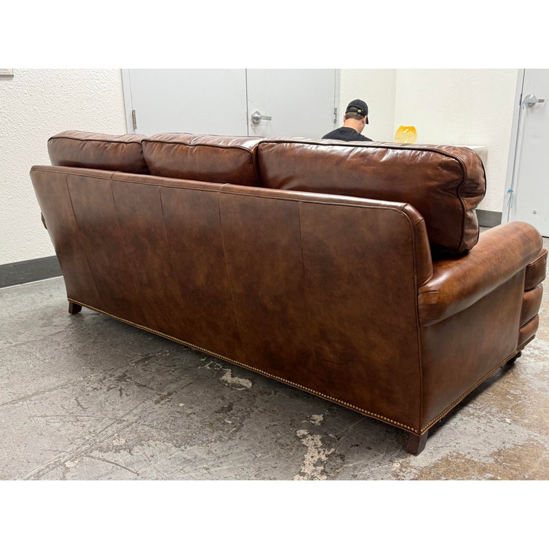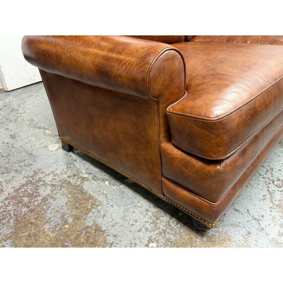 Design Plus Gallery presents an English Tradiiotnal Rolled Arm Leather Sofa from Hancock & Moore. Set the mood right with comfort + style with this appealing cognac toned leather sofa. The design works well for a variety of home, is incredibly well made by notoriously established craftsman and will withstand use for decades. The sofa is in good condition with minimal signs of visible wear for its age + use. Made in the USA.
