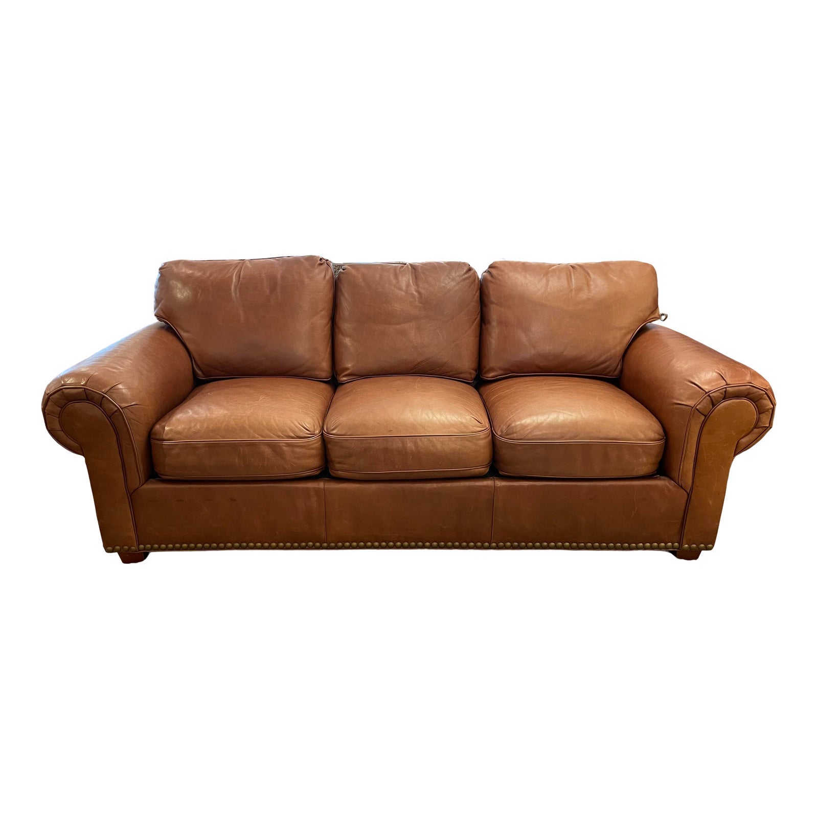 Design Plus Gallery presents the Hancock & Moore Leather Sofa. A sofa with rolled arms and seating for three is wrapped in a brown leather. There is some wear and sun damage on the back; sofa is in good condition. Nailheads run along the bottom of the sofa.