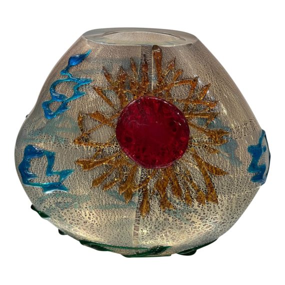 Design Plus Gallery presents a Glass Vase by Melloco. The heavy, primitive blown glass silhouette is embellished on front and back with glowing red-gold sunburst. Chunky blue clouds float in the open spaces. Signature etched on bottom. Little evidence of wear; good condition.
