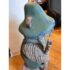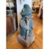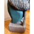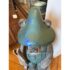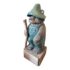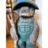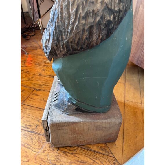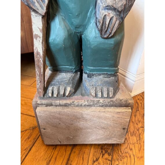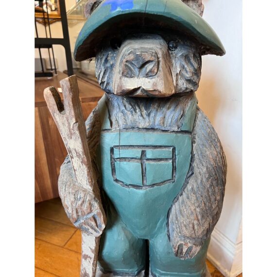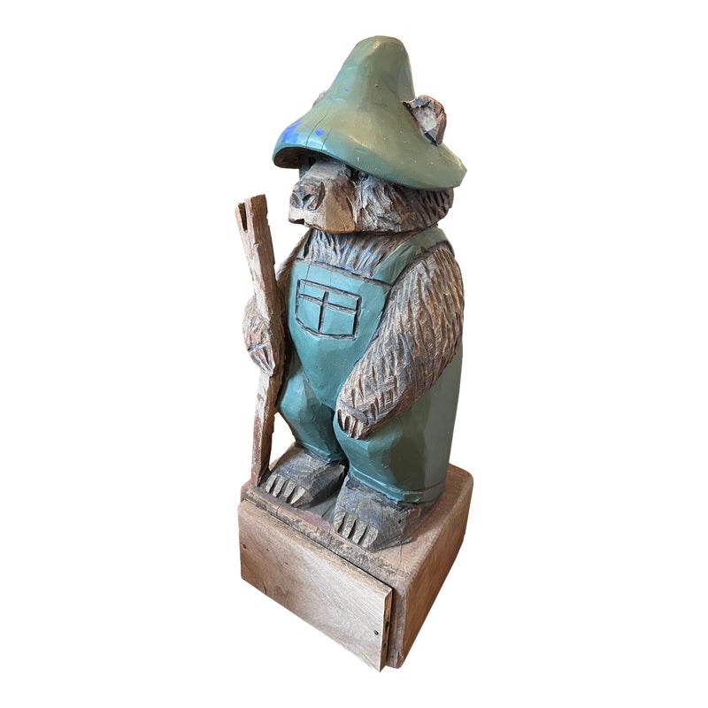Design Plus Gallery presents a Hand Carved Mountain Bear Sculpture. This rustic figural carving depicts a standing bear dressed in overalls and a broad hat, holding a walking stick and mounted on a block base. Hand hewn details throughout the fur, face, paws, and clothing give the piece a folk-art character, while the painted green surface shows age and variation that add to its timeworn appeal. It is in good condition with visible and minimal wear from usage.