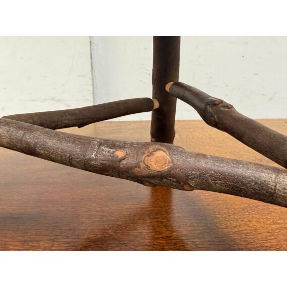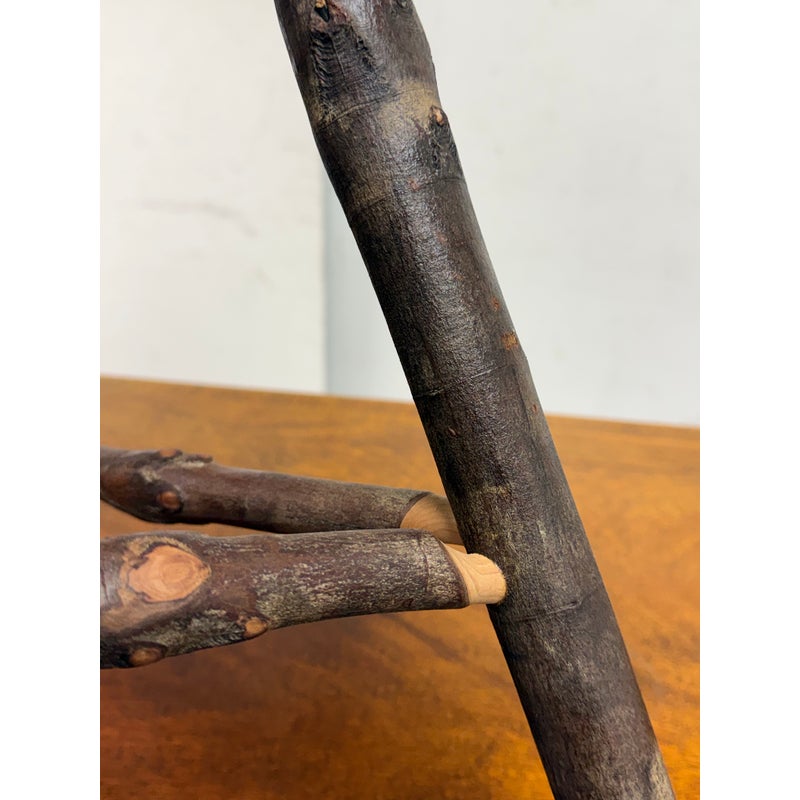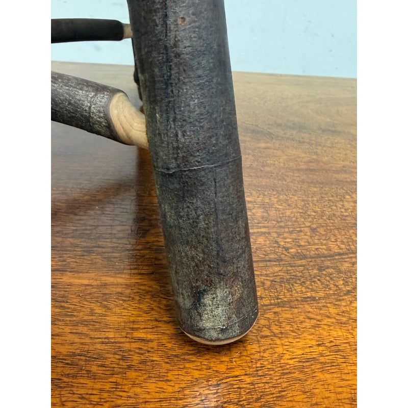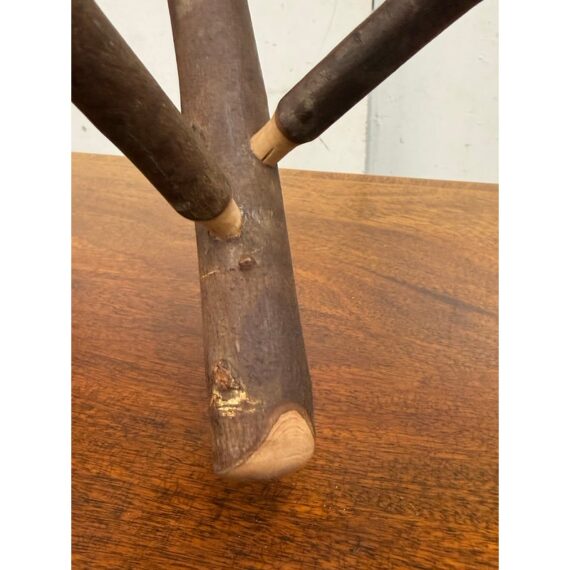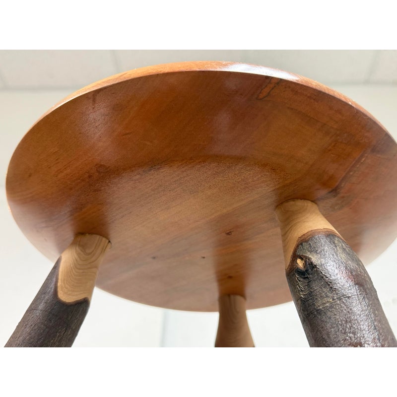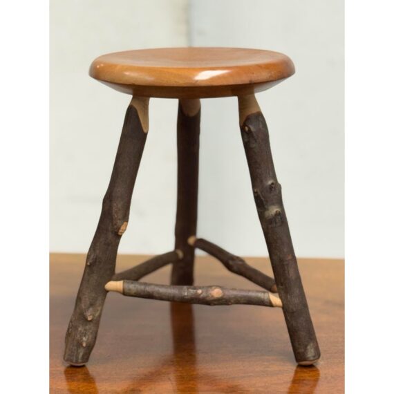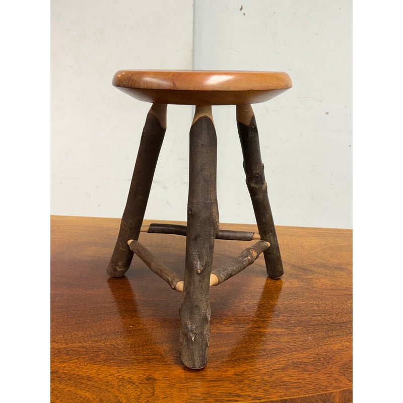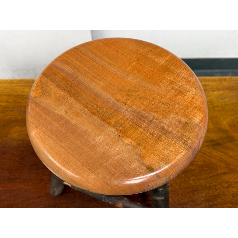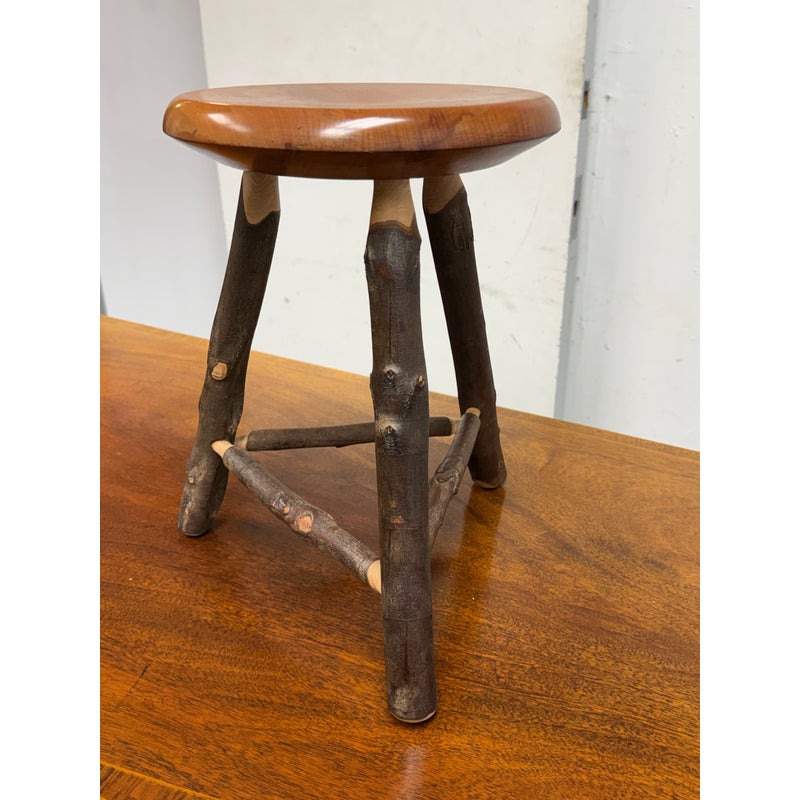 Design Plus Gallery presents a Wooden Stool that is Hand Carved. An authentic and natural stool that can live in or outdoors. It has three legs that are of tree limbs with limbs fused into them acting as supports, stretchers. The limbs come together at the base in a tee pee like position to hold the polished wood seat. It is in good condition with minimal visible wear for its usage. Made in the USA.