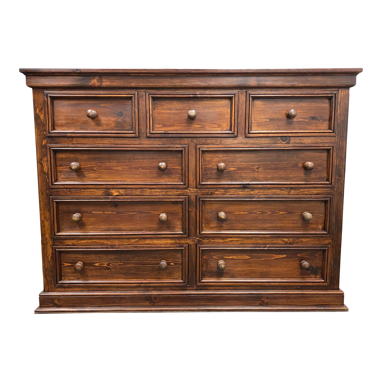 Design Plus Gallery presents a Pine Nine Drawer Dresser. Dark chestnut stain brings out the details in the moldings and the the solid wood dovetail joinery. Drawers are fixed into a smooth sliding mechanism with pulls made of the same pine of the frame. Visible wear through out includes scratching but the dark stain disguises well and gives a rustic touch. Top and base are anchored with a nicely finished molding detail.