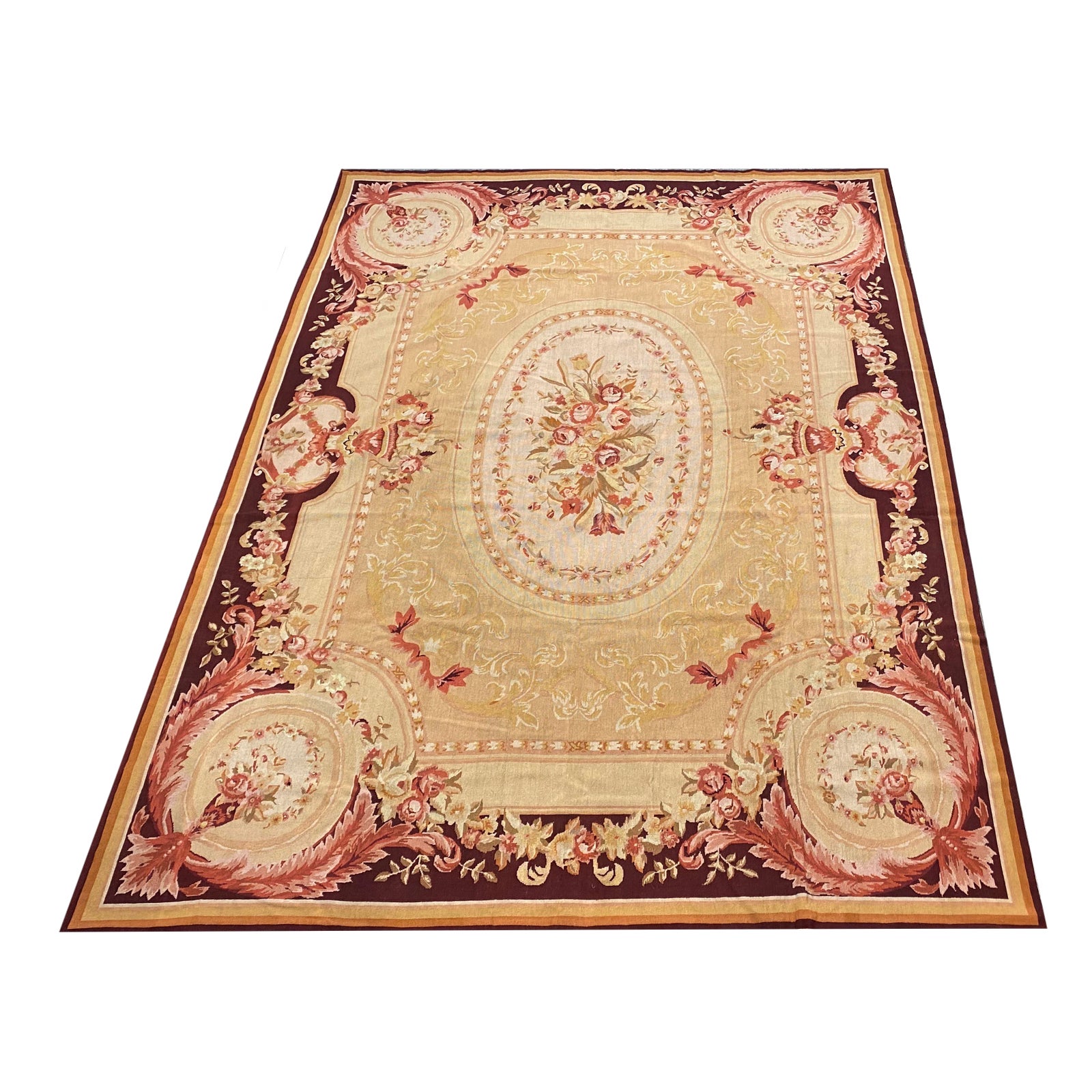 Design Plus Gallery presents a 8′-6″ X 11′-5″ Hand Knotted Aubusson Rug. French needlepoint rug is in excellent condition. There is some sun fading but the original weaving is fully in tact. Burgundy perimeter is lightens into a softer neutral palette. Floral and botanical motifs adorn the design of the rug.