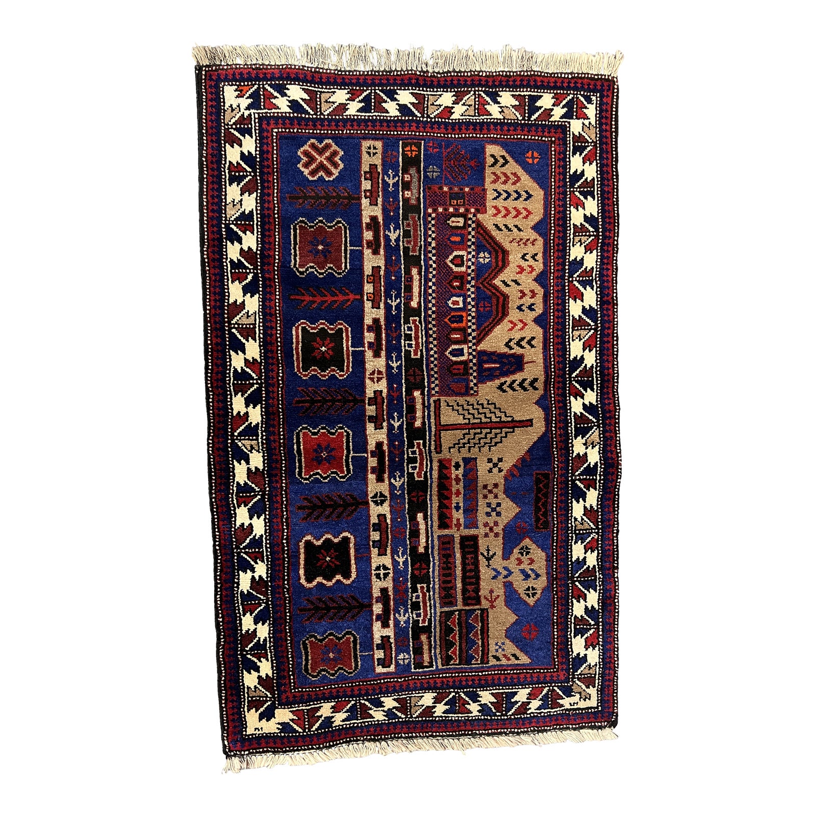 Design Plus Gallery presents a 2ft9.5in x 4ft10in Hand Knotted Wool Tribal Area Rug. This elaborately designed rug is constructed with wool. The field has a blue background. The rug offers a geometric style in its accents, which include botanics. Minor wear consistent with age + use; rug is in good condition.