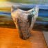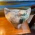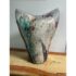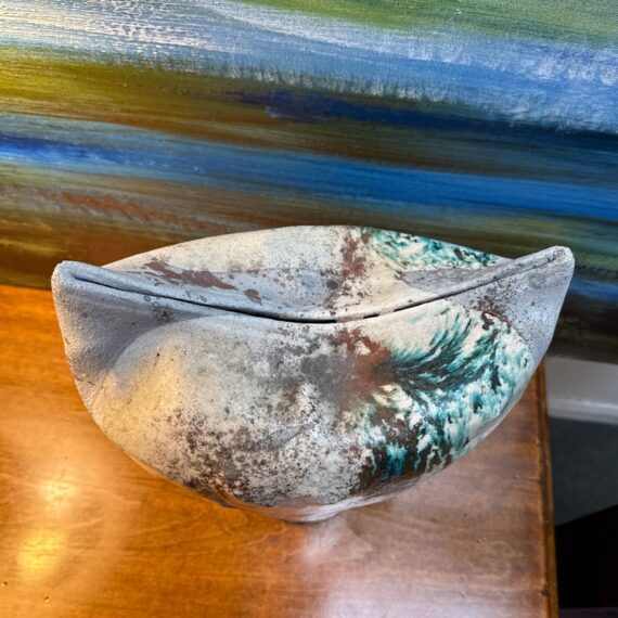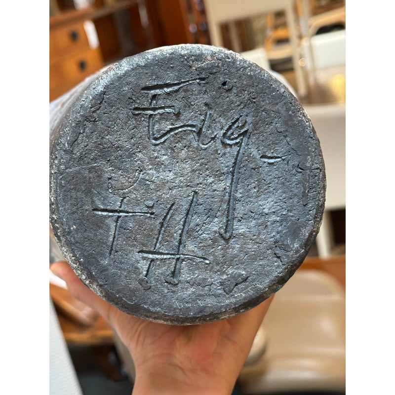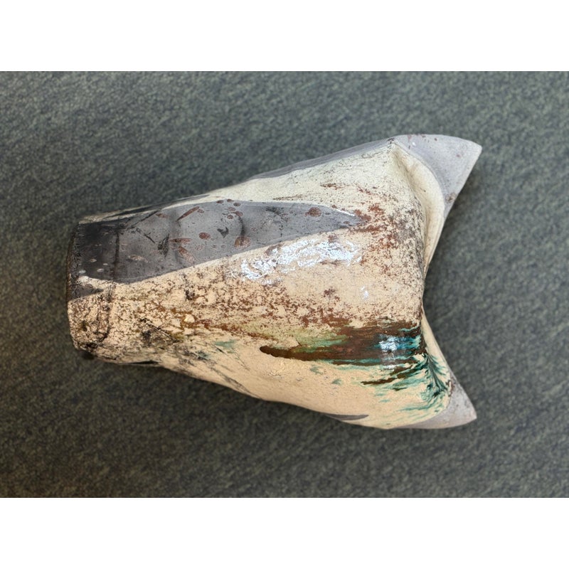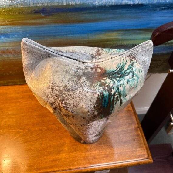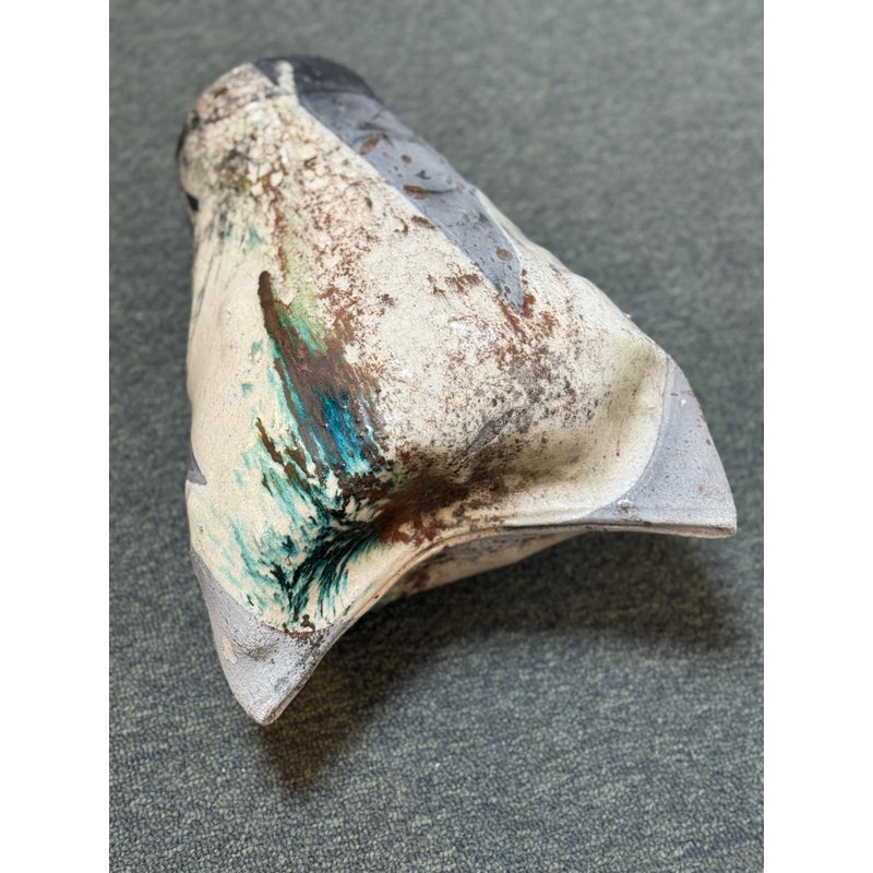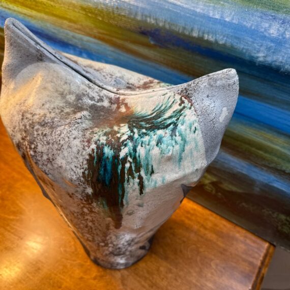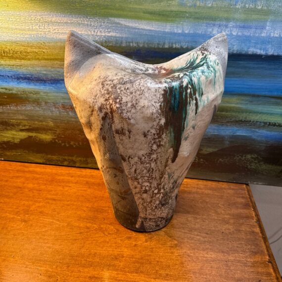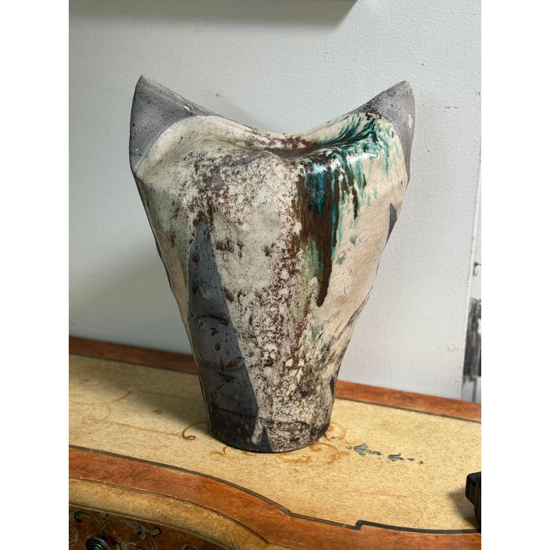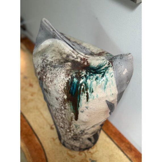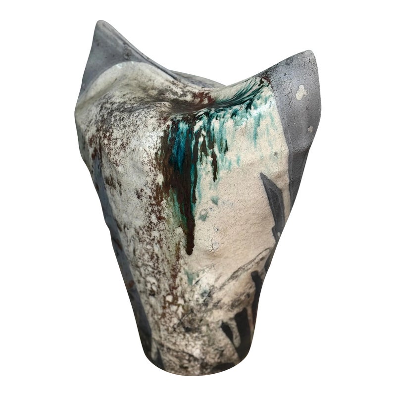 Design Plus Gallery presents a Vessel with Abstract Texture + Glaze, Signed Eight on its Base. The mostly gray vessel has paint of white, black and emerald green organically thrown and glazed onto its unusual shape. The piece is intact and in good condition for its usage.