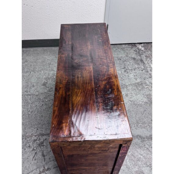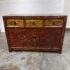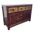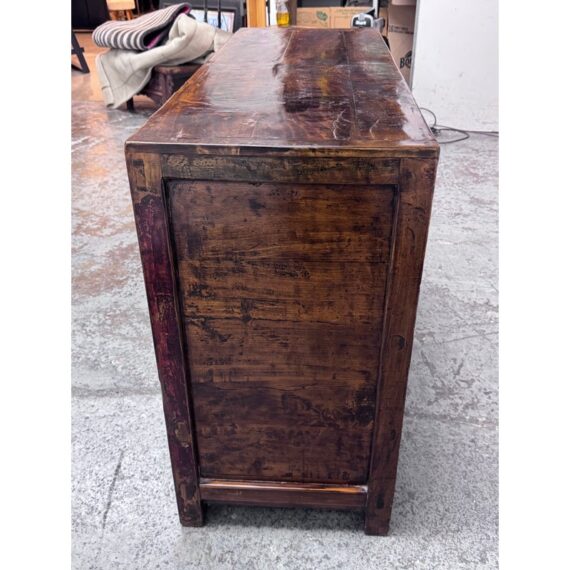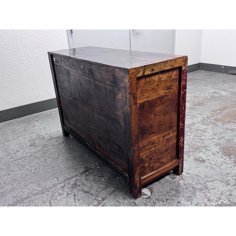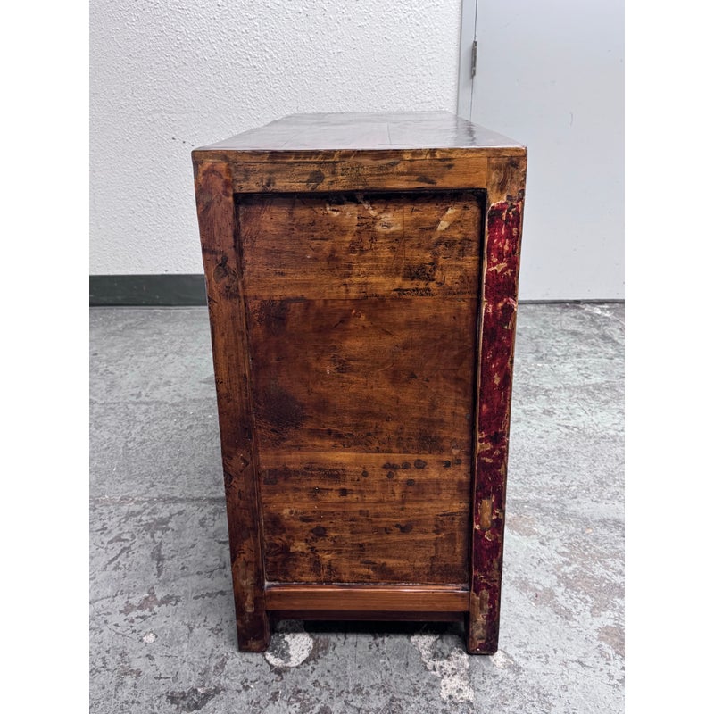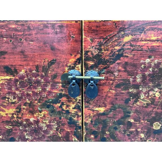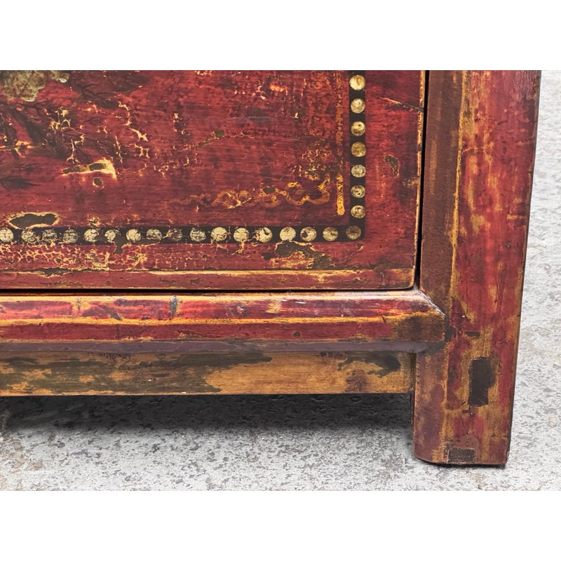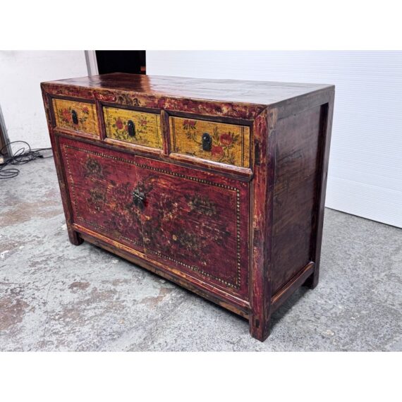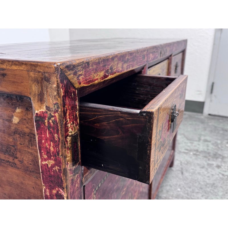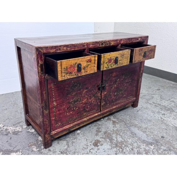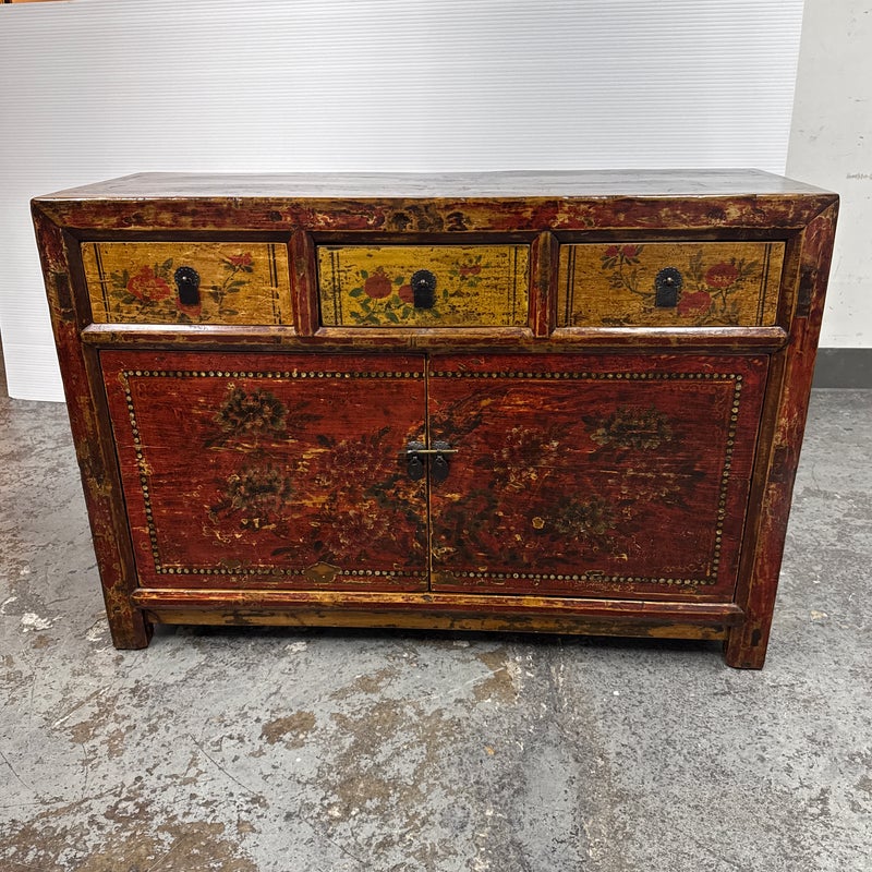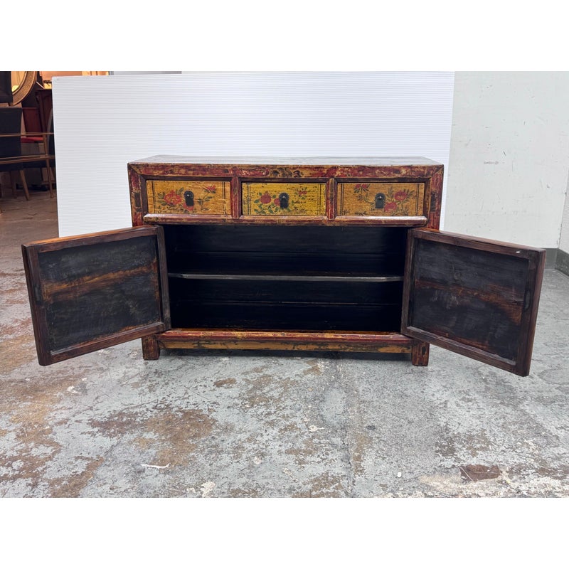 Design Plus Gallery presents a Hand Painted Chinese Side Board. This Chinese hand-painted sideboard blends time-honored artistry with everyday function. A dark-finish wood frame sets a rich backdrop for the vivid, antique-inspired surfaces: three top drawers in a distressed yellow are adorned with delicate floral motifs, while the two lower doors glow in red with coordinating hand-painted florals. Traditional circular brass plate hardware with a pin latch provides an authentic finishing touch. Behind the doors, a removable single shelf allows you to customize storage for serve ware, linens, or media components. Intentionally distressed to evoke the character of a well-loved antique, this piece adds warmth and cultural charm to dining rooms, living spaces, or entryways. In good condition, visible and minimal wear from usage.