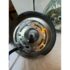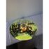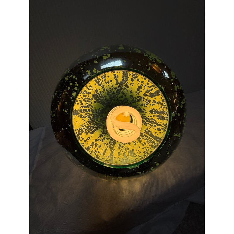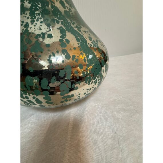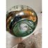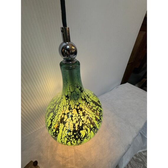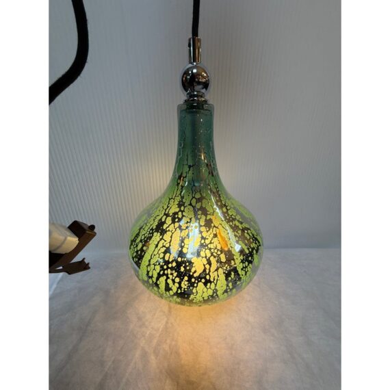 Design Plus Gallery presents a Vintage Hanging Pendant. The pendant is in the shape of a water droplet with a silver mercury glass inspirited body with green swirling paint dripped over its entirety. The pendant has a nickel plated canopy as well as connector to the cord. It is in good condition overall with minimal wear for its vintage usage.