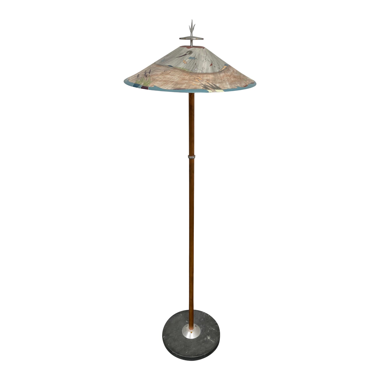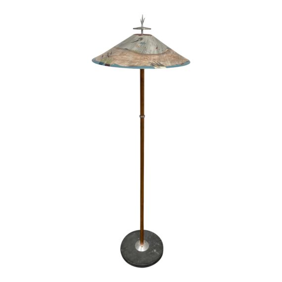 Design Plus Gallery presents a Hand Painted Post Modern Floor Lamp. Charming mixture of material blends stone, copper, sparkles and a hand painted ceramic shade. Shade shows an embossed landscape with a horizon line. Small perforations in the shade cast light. Minor wear through out, floor lamp is in good condition. Floor lamp was custom made by a local artist in Napa, California. USA.