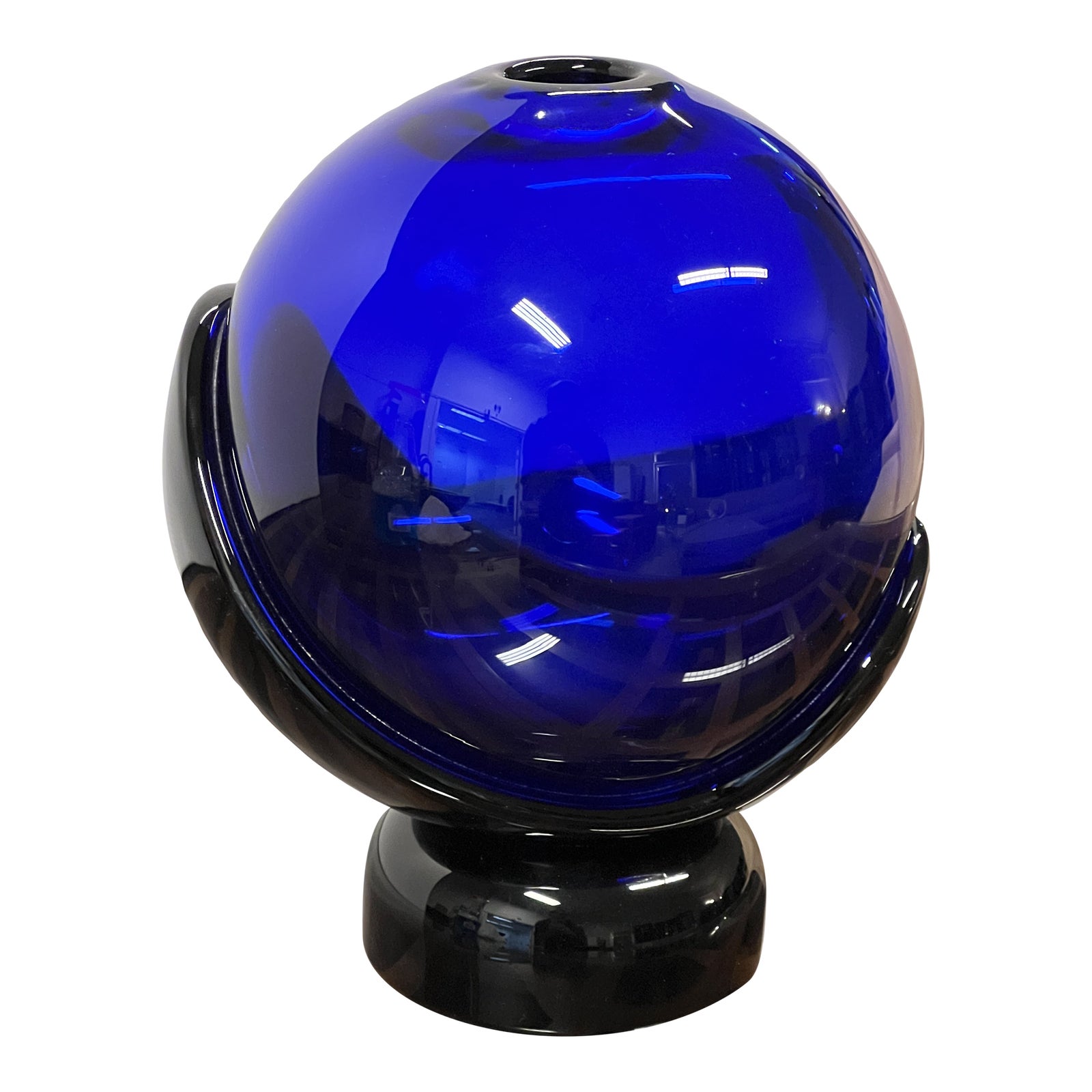 Design Plus Gallery presents a Handblown Venetian Cobalt Glass Vase. Incredibly beautiful and visually appealing, can also be used as a paperweight in the office. Rich cobalt blue set off with a black ascent that cradles the orb. This vase is in good condition.