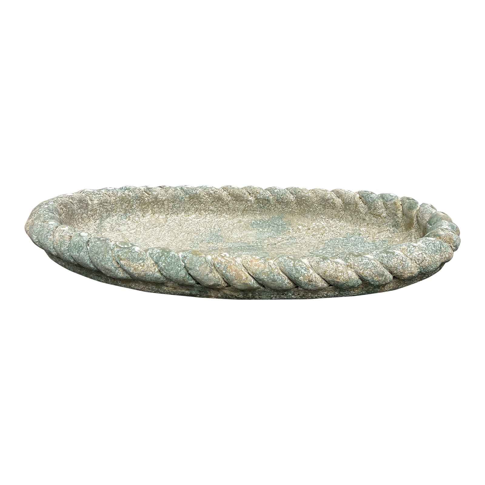 Design Plus Gallery presents a Handcrafted Oval Braid Decorative Tray. The tray is constructed with stone in an oval silhouette. The tray’s raised edges have a braid pattern similar to rope. It has a distressed green and white finish. Minor wear consistent with age + use; tray is in good condition.