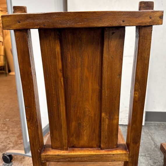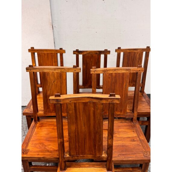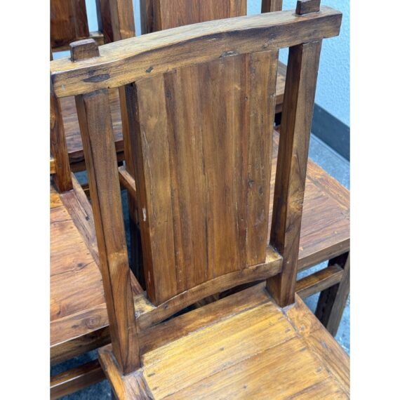 Design Plus Gallery presents a Set of Six Handcrafted Solid Wood Dining Chairs. This matching set is built from solid wood and shows natural grain variation and tonal shifts across each chair. The design pairs a flat plank seat with a tall, framed back and inset panel, with sturdy square legs and apron supports for a stable feel. Subtle joinery details and hand worked character are visible throughout, making each chair slightly unique while maintaining a consistent overall look. They are in good condition with visible and minimal wear from usage.