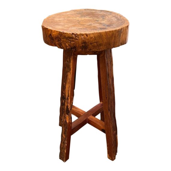 Design Plus Gallery presents a Handcrafted Tree Stump Stool. A unique and rustic piece of furniture. Crafted from teak woods and a natural cut tree stump. The trunk top is sanded and waxed to a smooth finish, and the teak legs are live edge. With its unique shape and natural beauty, the stool is the perfect addition to your living space. Place it next to a sofa or armchair as a unique side table, or use it as a stool for extra seating. Its rustic elegance makes it a timeless piece of furniture. Artist unkown. Wear from usage + age.