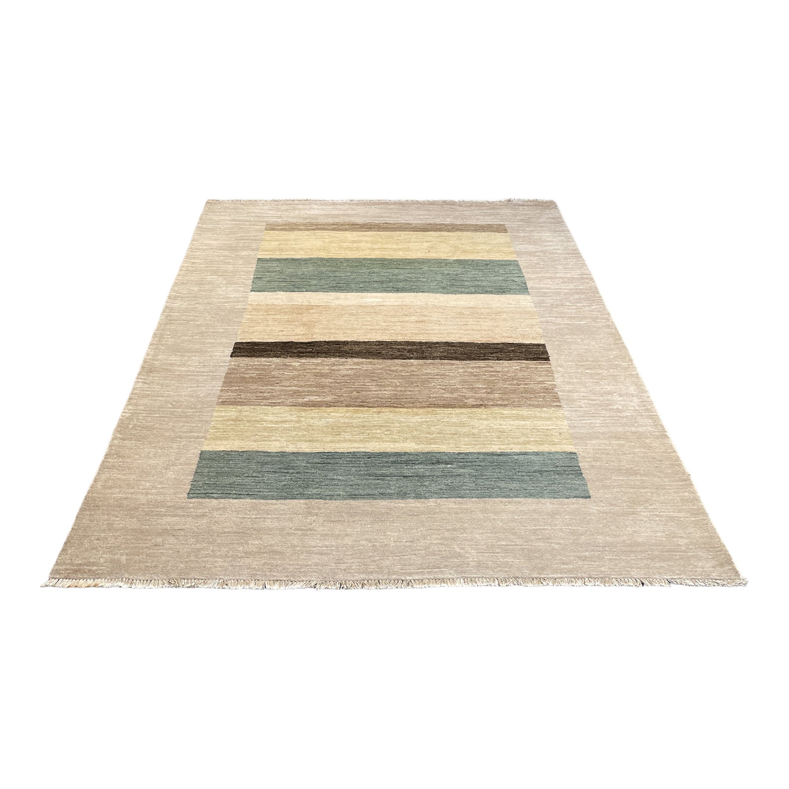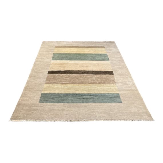 Design Plus Gallery presents a 6ft7in X 9ft4in Hand Knotted Gabbeh Rug. 100% soft wool is woven on a cotton foundation to create this contemporary area rug. This is a lovely rug is tufted with subtle neutral stripes and short fringe. Small stain in one end of fringe.