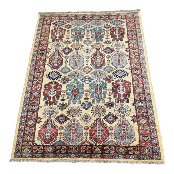 Design Plus Gallery presents a 4′11″ × 6′11″ 100% Vegetable Dyed Wool Kazak Rug. With multiple tribal characteristics and motifs of colors of rust, gold, teal on an ivory background it will enhance any floor space with wonder. Short natural fringe. Hand knotted. Light wear; condition is consistent with age and use.