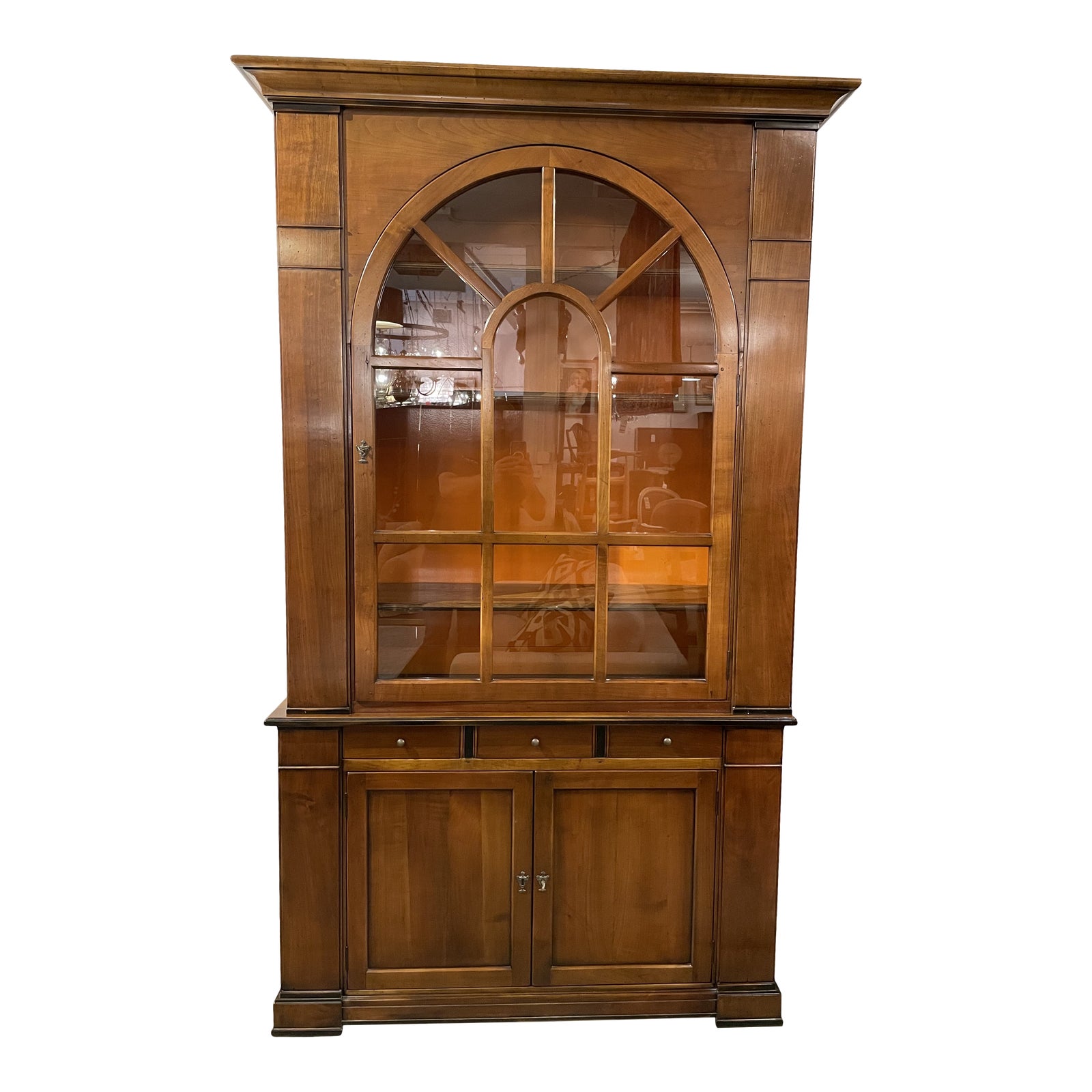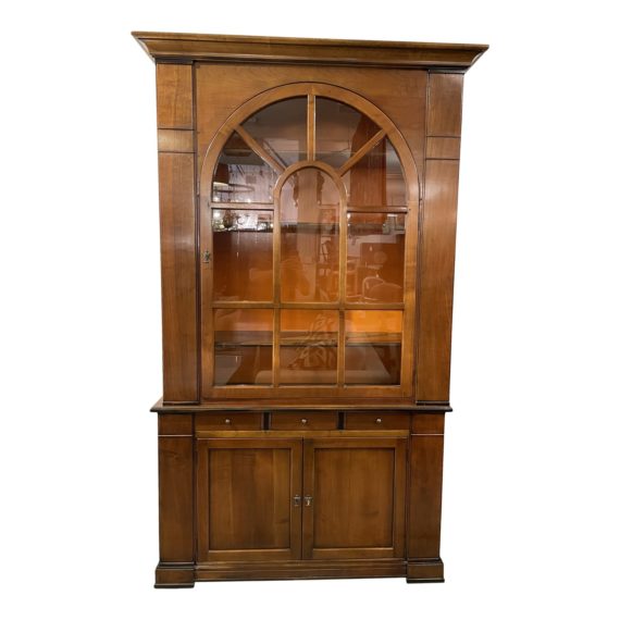 Design Plus Gallery presents a Hans Hopfer Roche Bobois Post Modern Arched Cabinet. German architect Hans Hopfer is known for his iconic Mah Jong series with Roche Bobois. This departure from his usual modern and modular pieces references traditional joinery techniques. The wood is a warm, chestnut tone with wood veneers that surround the solid frame with a Neo-Classical touch. Narrow + elegant proportions come with both concealed and display storage with adjustable shelves in a tongue and groove system. Interior spaces are stained a warm and inviting orange. Comes with lock and key for base’s cabinet. Glass pane door emulates a beautiful arched architectural window. Minor wear on surfaces, good condition.