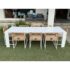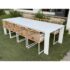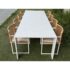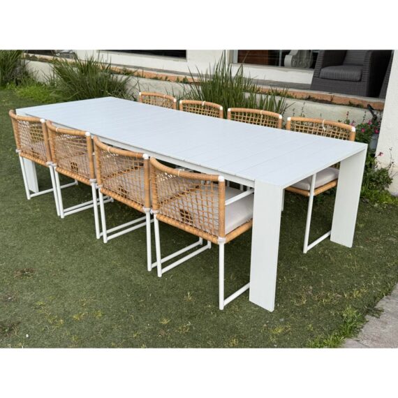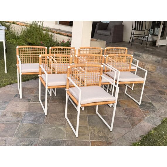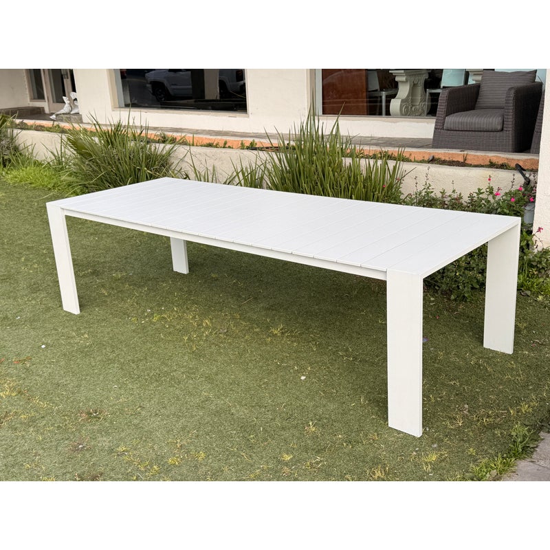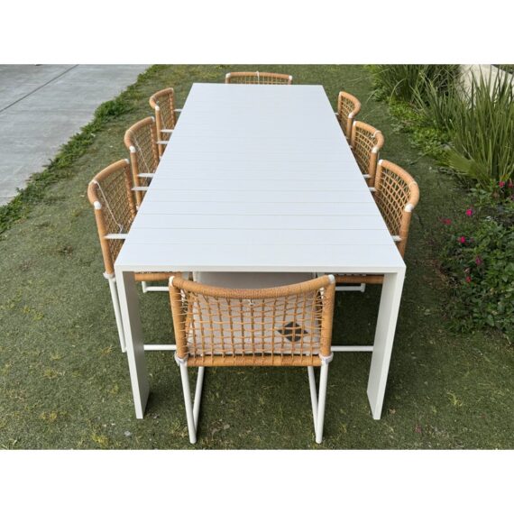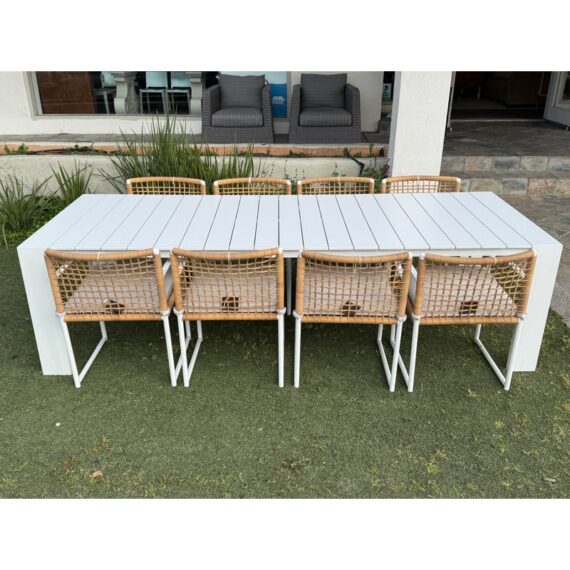 Design Plus Gallery presents the Hayden Table + Set of Eight Loop Dining Chairs from Harbour Outdoor. The brand is renowned for their indoor aesthetic that meets outdoor performance with this modern dining set is made for a variety of spaces. This table is their statement to simplicity with clean angles and modern styling. It is defined by wide legs and designed as the perfect outdoor table for up to ten. Enjoy the large rectangular surface with white slatted extruded aluminum that’s streamlined + functional with eight of their Loop Dining Chairs. Enjoy the Loop’s plush cushions and a gentle curved back, part of a powder coated extruded aluminum frame. The seat and back feature an open weave all–weather wicker that balances the contemporary with the modern. Impeccably crafted and quick drying for endearing comfort and style. The set is in good condition that is consistent with usage. Made in Australia.