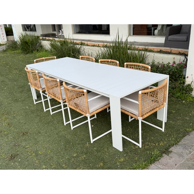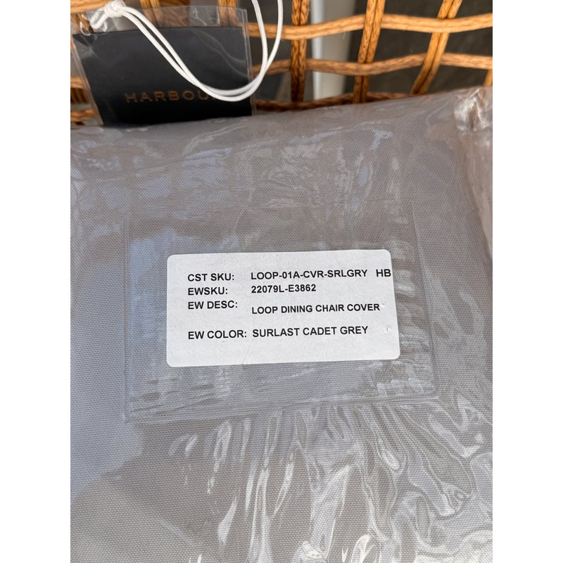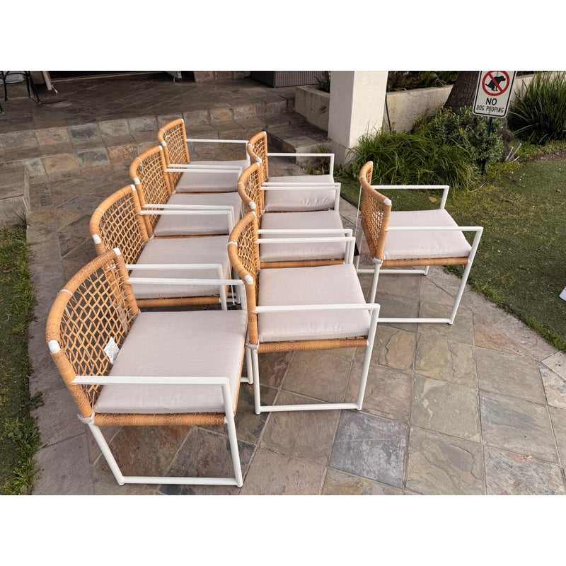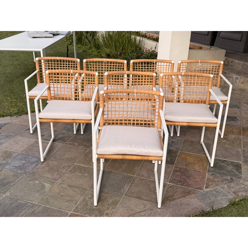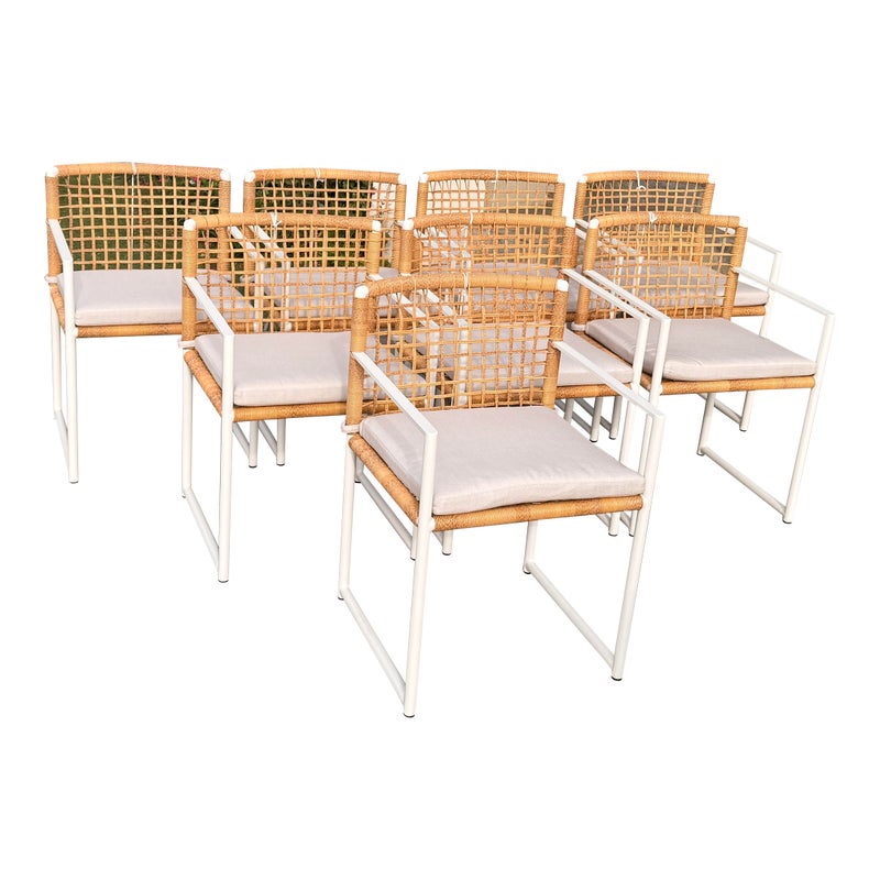 Design Plus Gallery presents a Set of Eight Loop Dining Chairs from Harbour Outdoor. The Loop collection blends clean angled lines with the grid of the wicker to create a namesake looping design. Enjoy their plush cushions and a gentle curved back, part of a powder coated extruded aluminum frame. The seat and back feature an open weave all–weather wicker that balances the contemporary with the modern. Impeccably crafted and quick drying, these versatile chairs complete any outdoor space. They are all in good condition with minimal wear for their usage. Made in Australia.