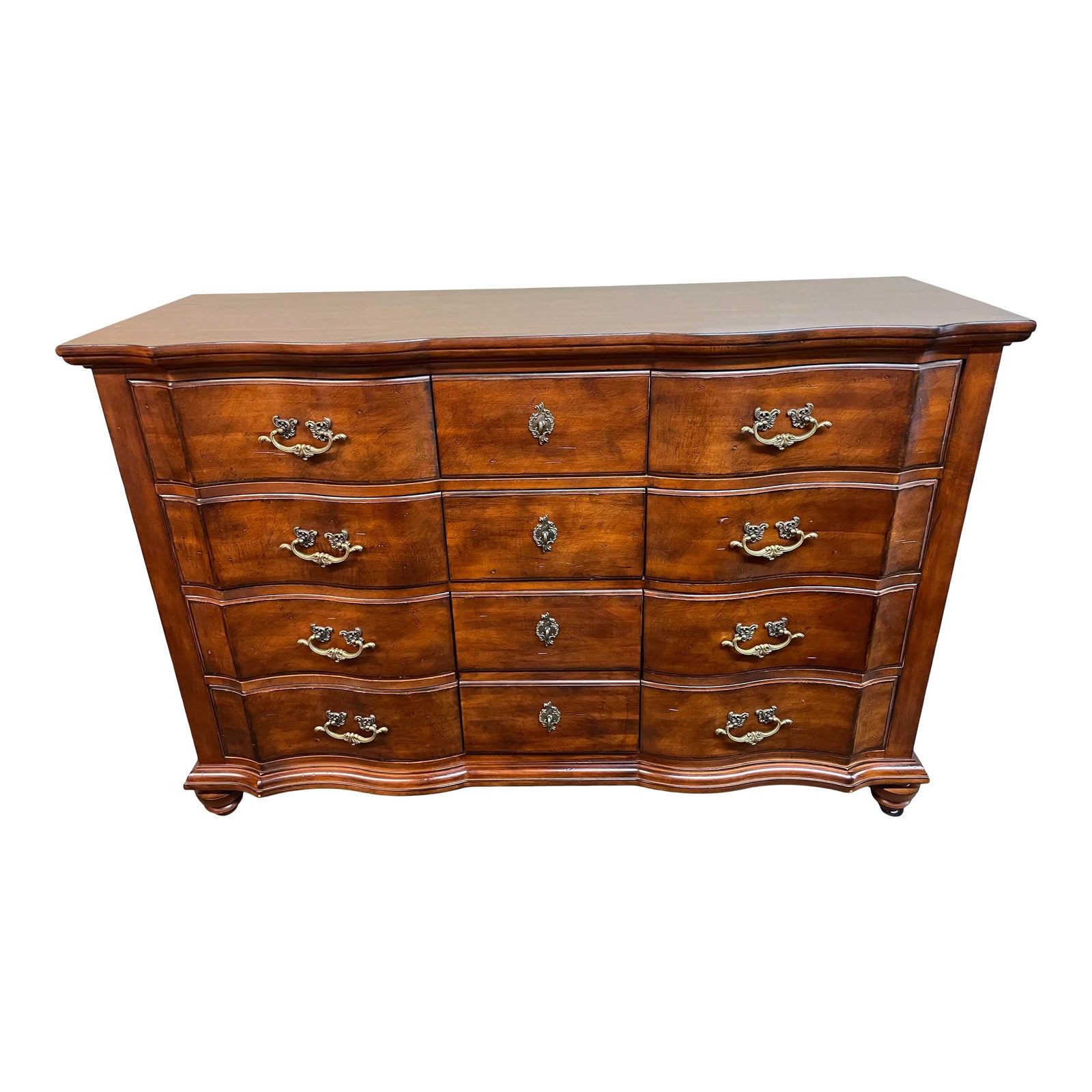 Design Plus gallery presents a Harden Bristol Channel Serpentine 10 Drawer Dresser. Dovetail maple joinery makes up the drawer construction. Exterior is finished a rich and beautiful Chestnut tone and is antiqued for a French Provincial look. Oiled brass hardware further complements the French styling. Frame sits atop baluster feet within a beveled perimeter. Bottom two central drawers are actually a single cabinet door. For over 170 years and through 5 generations of family ownership, Harden Furniture is an American-Made manufacturer in McConnellsville, New York that has been handcrafting fine quality wood furniture for decades.