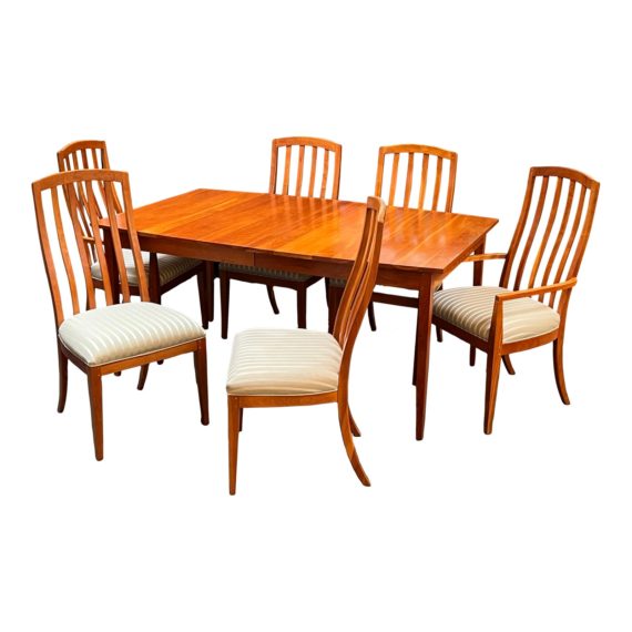 Design Plus Gallery presents a Classic Dining Set by Harden Furniture. The cherry boat-shaped dining table extends from 66.5-114 inches with 3 beautiful leaves. The set of six chairs, two with arms, have an elegant silhouette that cradles the back. The cushioned seats are upholstered in a soft sage and beige jacquard stripe, for neutral hued comfort. Light surface wear/soil; condition is good for age and use. Made in USA.