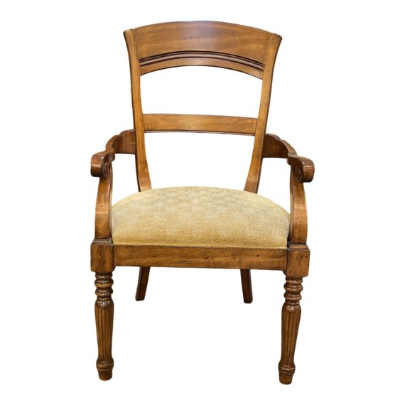 Design Plus Gallery presents a Harden Side Chair. Beautifully curving carved silhouette and turned legs frames the deeply cushioned pale gold seat. A lovely bedroom or extra chair.
