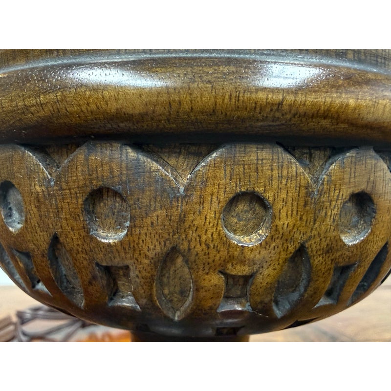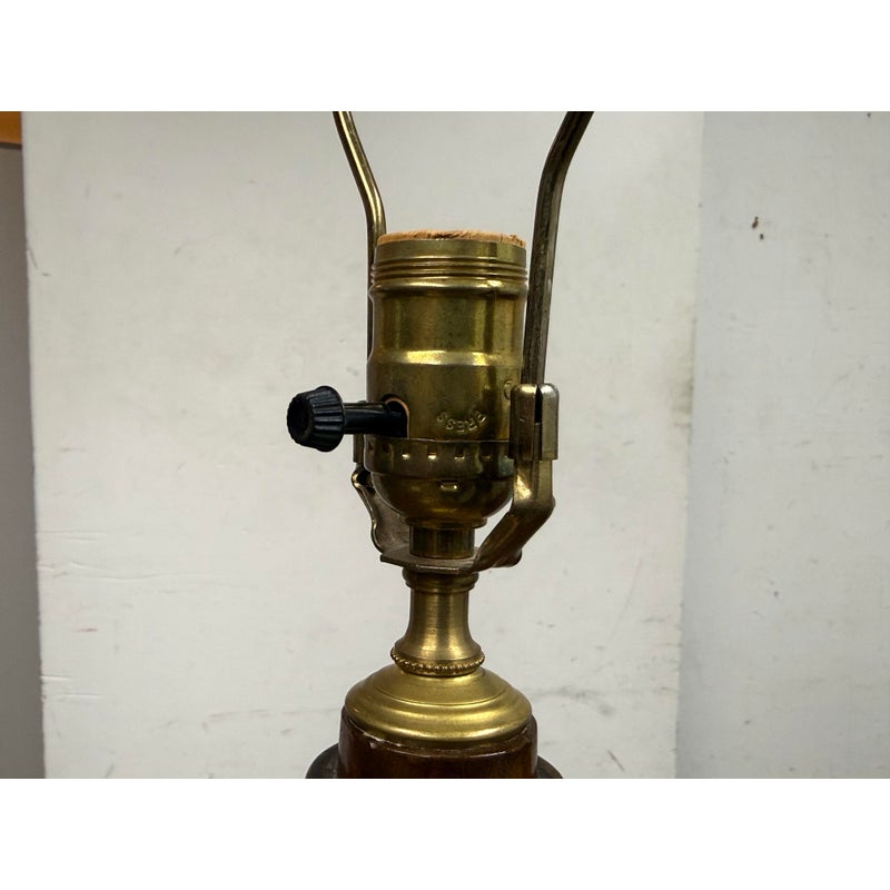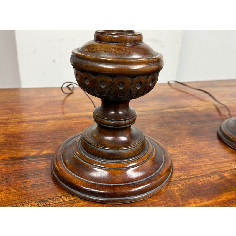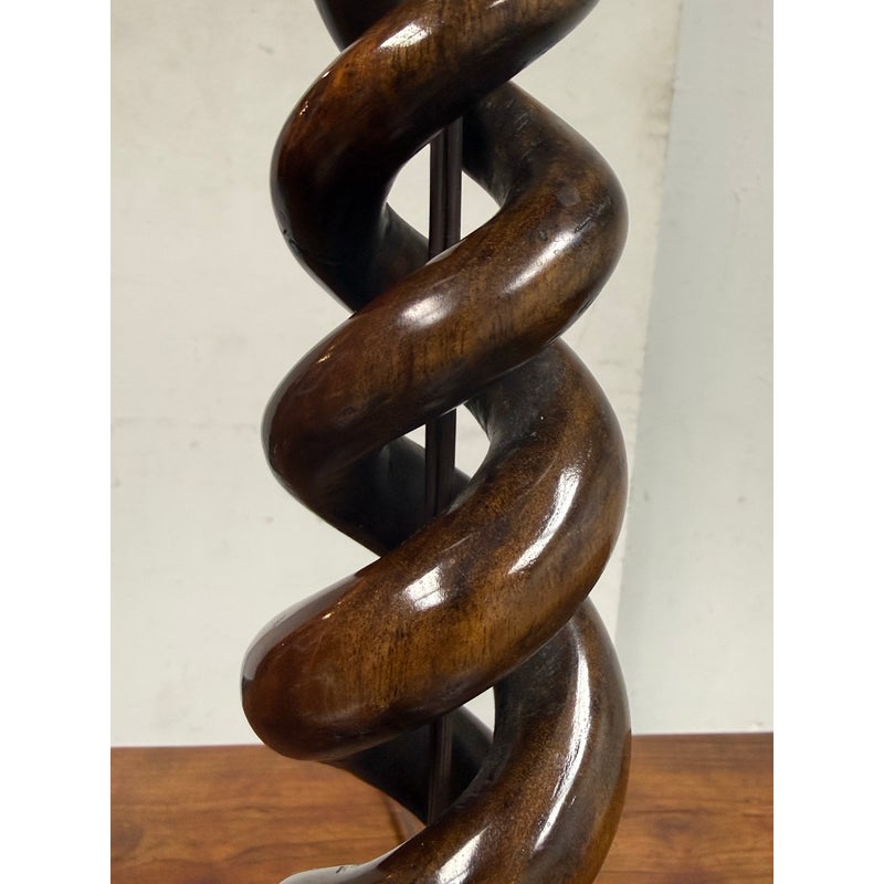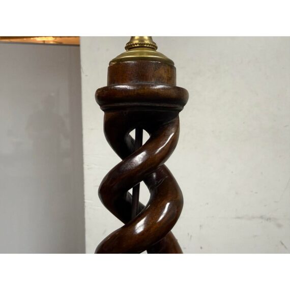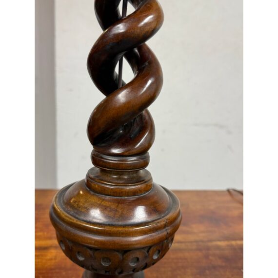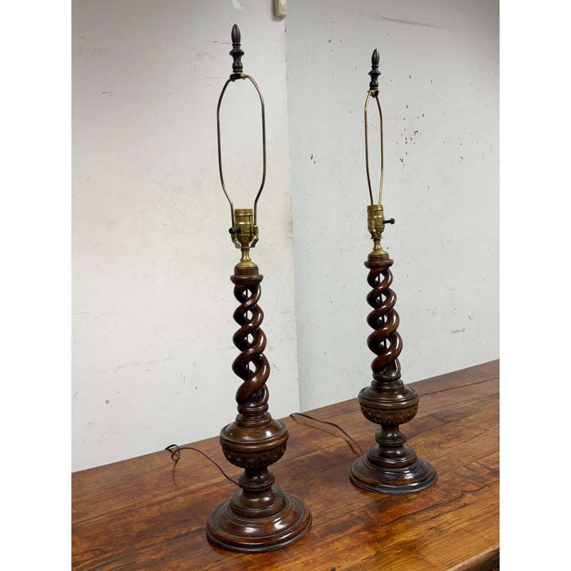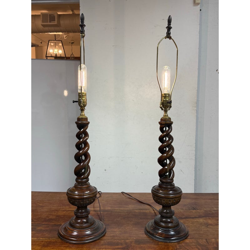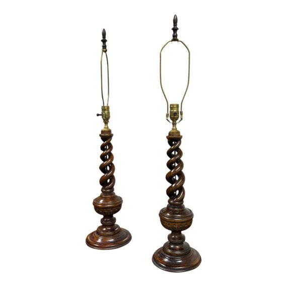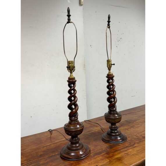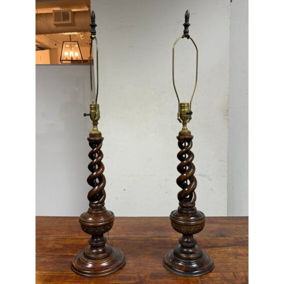 Design Plus Gallery presents a Pair of English Oak Wood Barley Twist Table Lamps from Harpers Antiques. They have a candlestick holder type design, being that they are tall and proportioned as such. For all we know these could have been candlesticks with their design forming into a table lamp over time by way of an electrician. Solid carved wood with brass hardware, the two lamps are without lamp shades. They are in good condition for their usage with minimal wear.