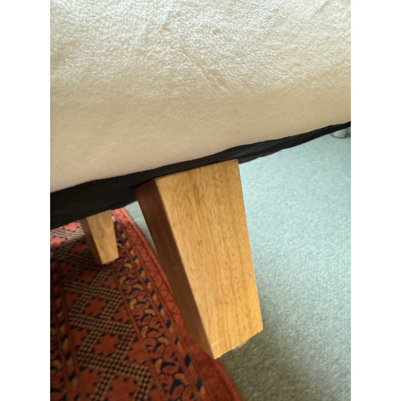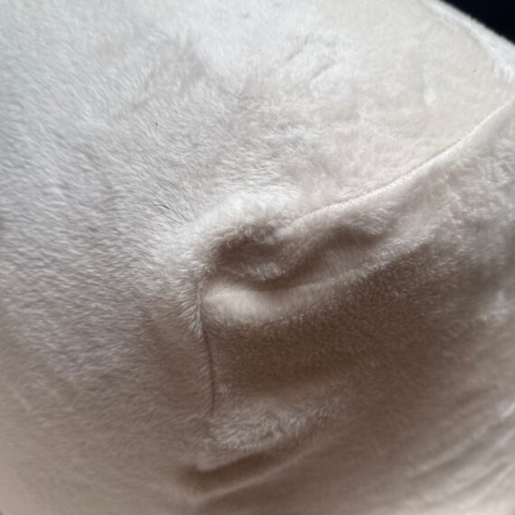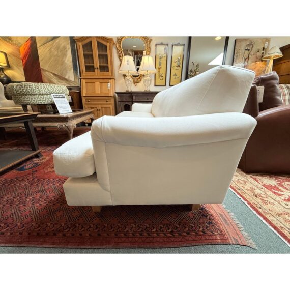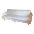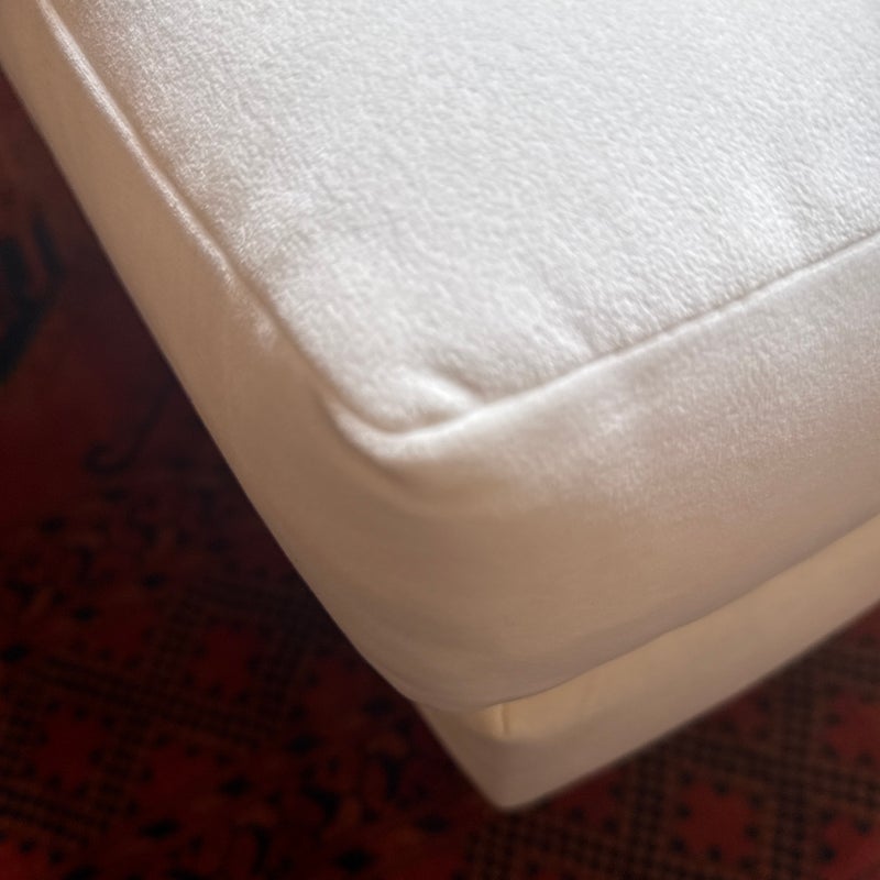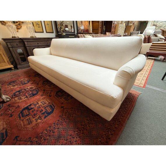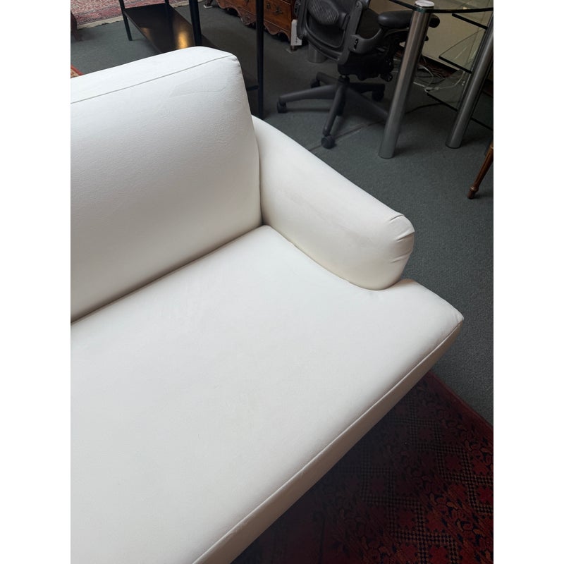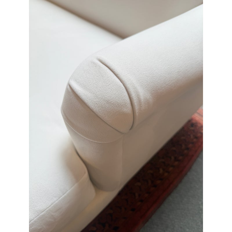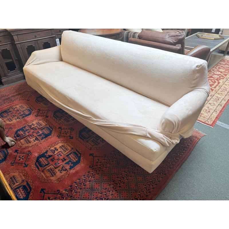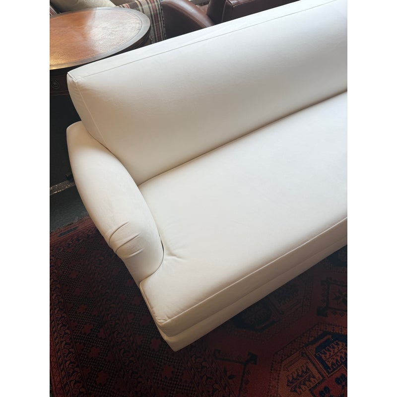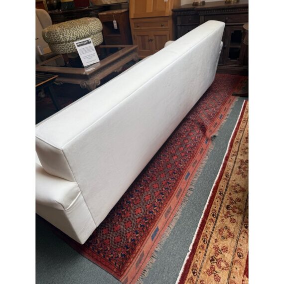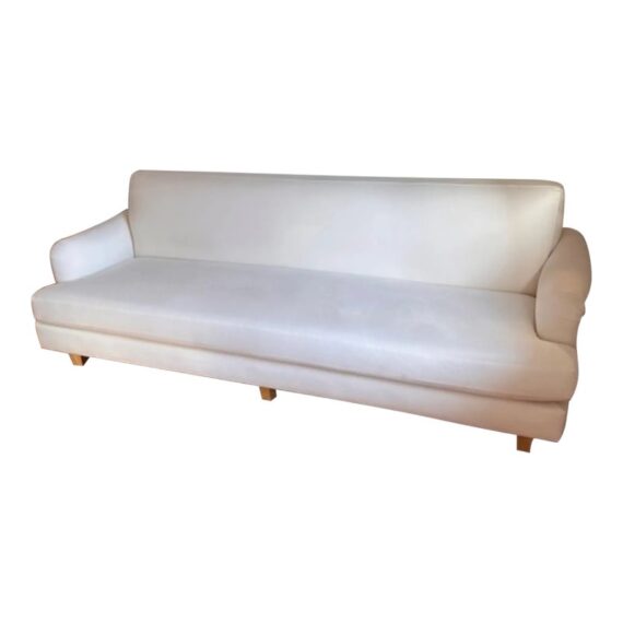 Design Plus Gallery presents a Custom Clarion Sofa by Harrington Galleries. Executed in a soft white velvet like upholstery, the silhouette is all about clean, elegant lines. The fixed back and bench seat welcomes a small crowd. Simple track arms embrace, light tapered wood legs elevate. Includes protective slipcover, shown. Little wear; condition is good. Made in USA.