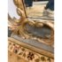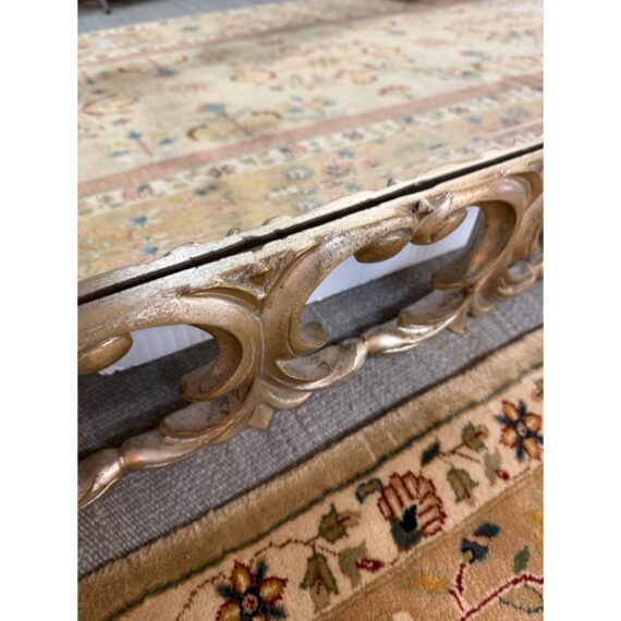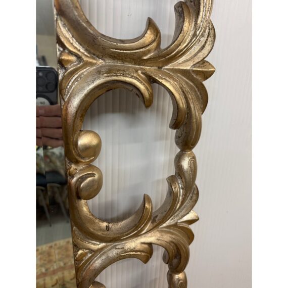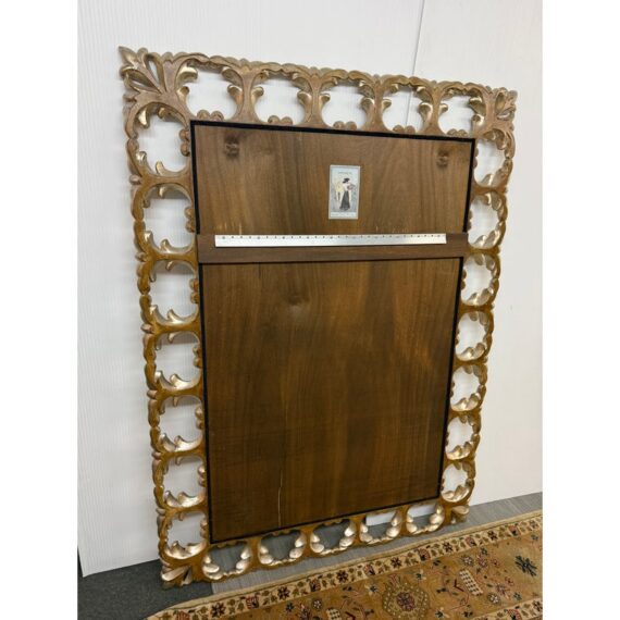 Design Plus Gallery presents a Remarkable Wall Mount or Leaning Full-Length Mirror. Talk about extravagance, this exquisitely carved wood has scroll details combined with craftsman dovetail joints all with a gilt finish. The original Harrison & Gil manufacture label with serial number both written and inscribed into the wood. There is a metal plate on the backside to securely hang into the wall in the most secure method of them all. It is in good condition for its usage.