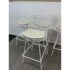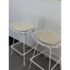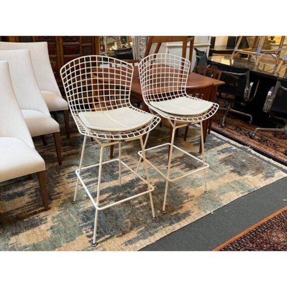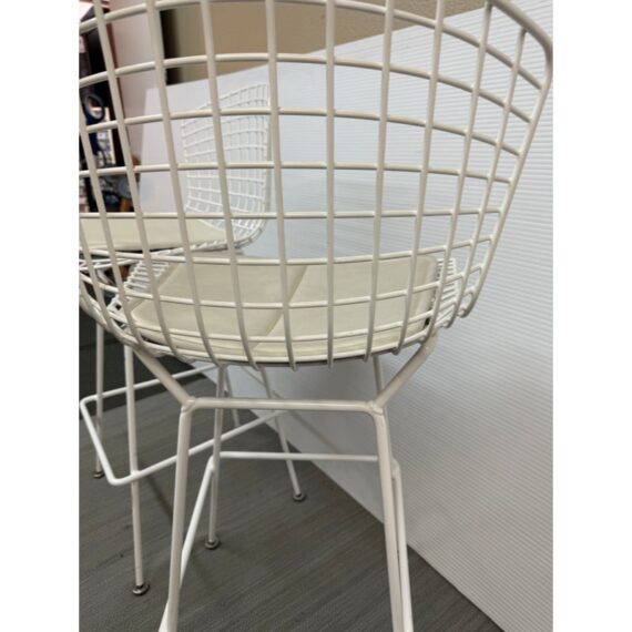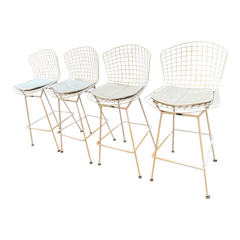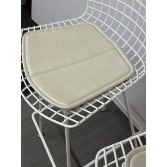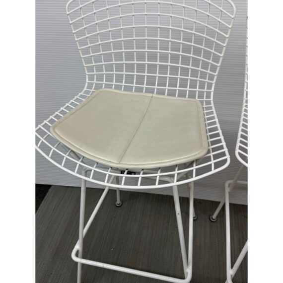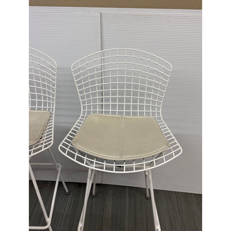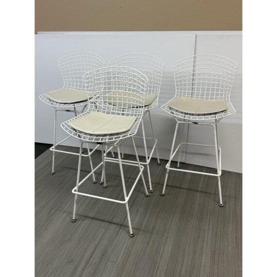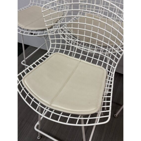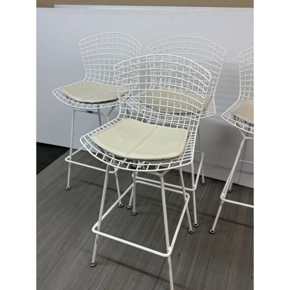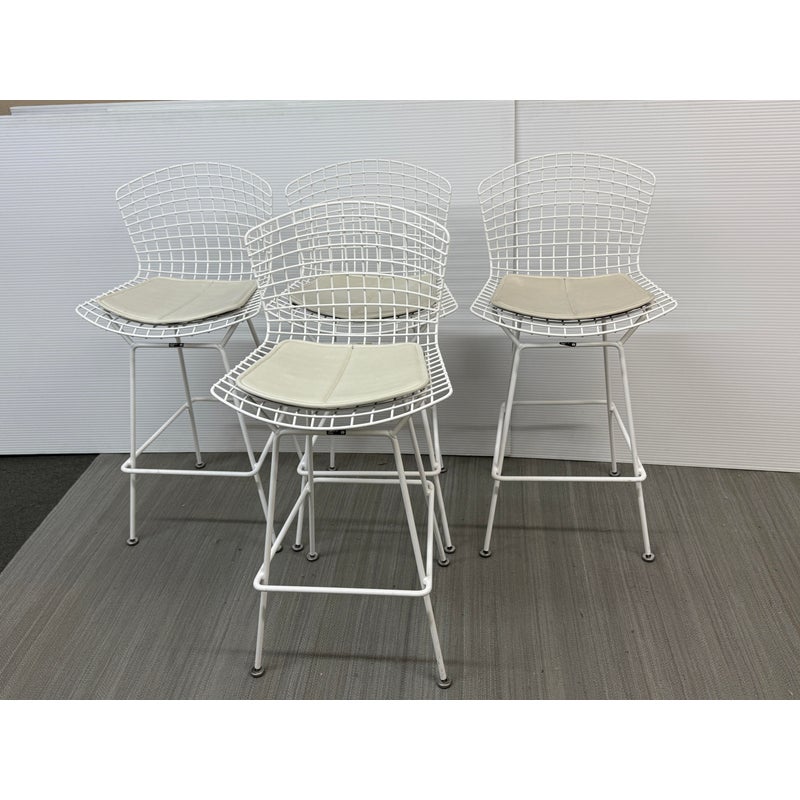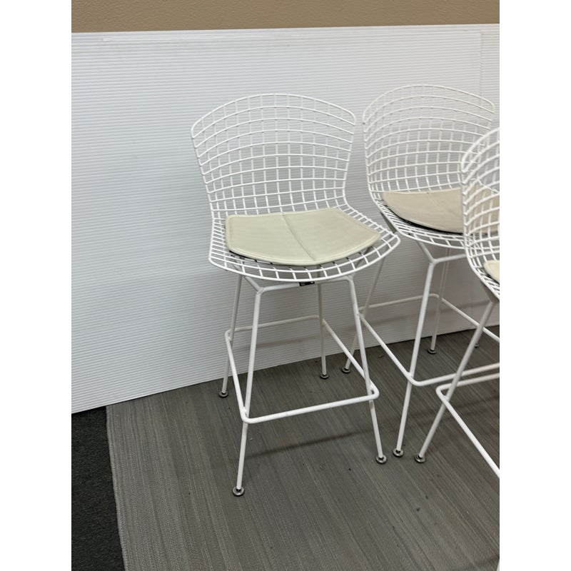 Design Plus Gallery presents a Set of Four Knoll Bertoia Counter Stools. The stools are produced by Knoll for Design Within Reach, and designed by Harry Bertoia in 1952, yet the design remains current today. The seats and bases are constructed of chromed metal wire, powder coated white. The seat pads are a with off-white seat pad (vinyl), they have snaps to keep them in place. Made in Italy. Condition is good for age and use