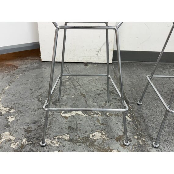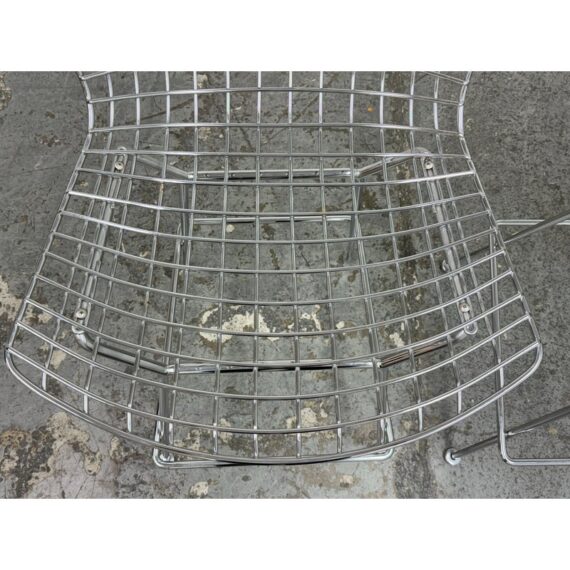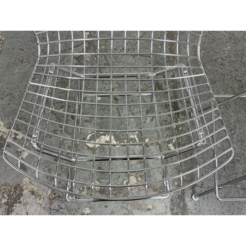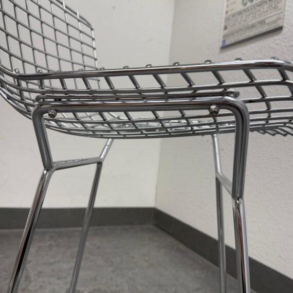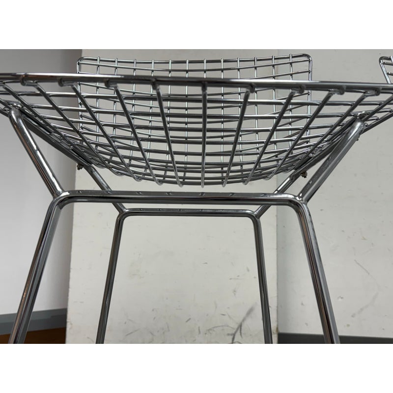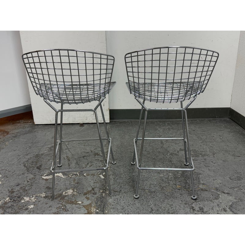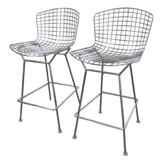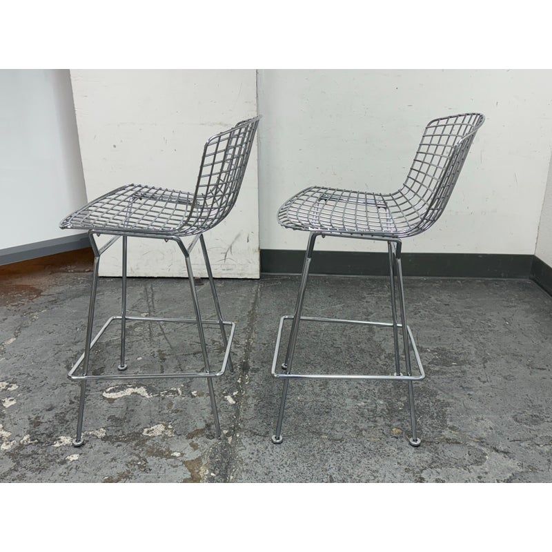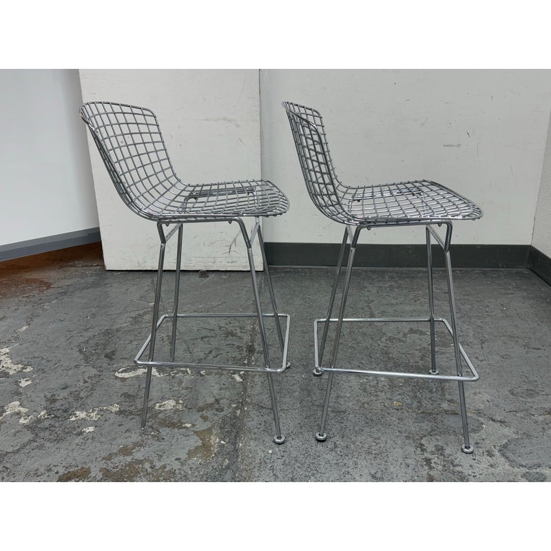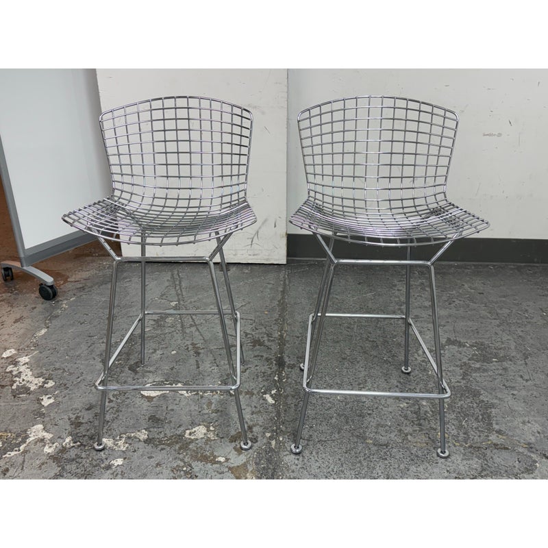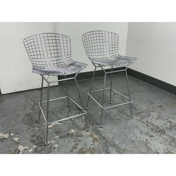 Design Plus Gallery presents a Pair of Bertoia Bar Stools from Knoll Studios. These iconic stools were designed in the mid 20th century by Harry Bertoia and have made a lastly impression in design. Whether used in the home, restaurant, or office these stools allow timelessness to your space. Two feet are missing from one chair. No seat pads included. Otherwise the chairs are in good condition with minimal wear for their usage.