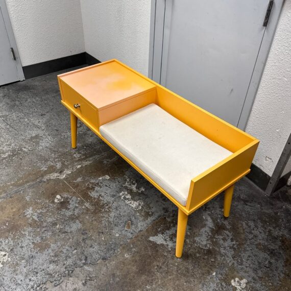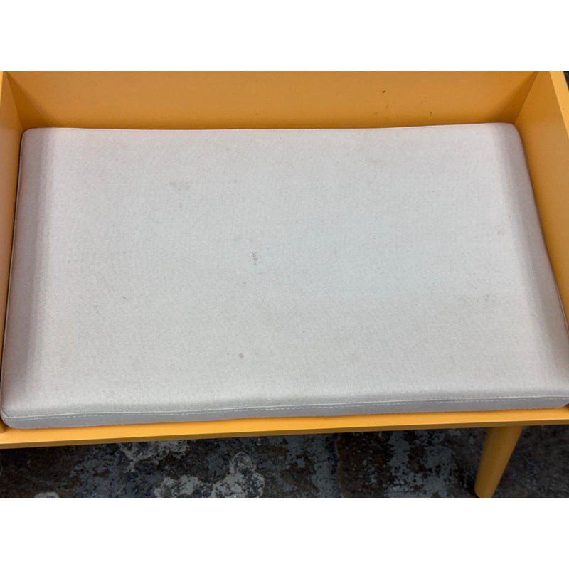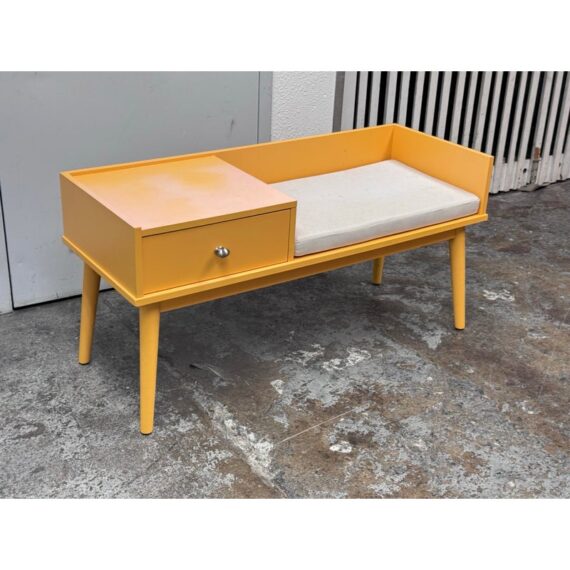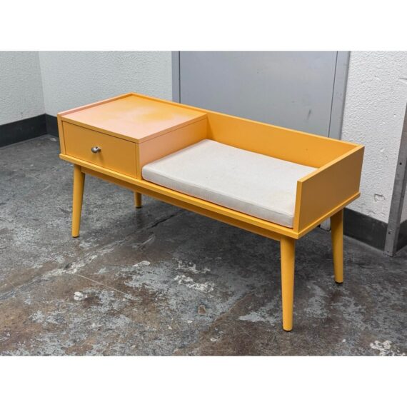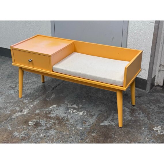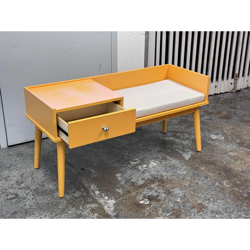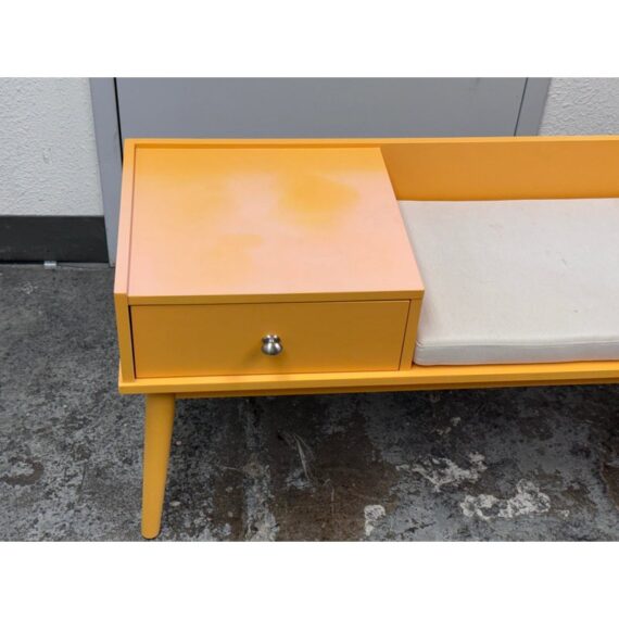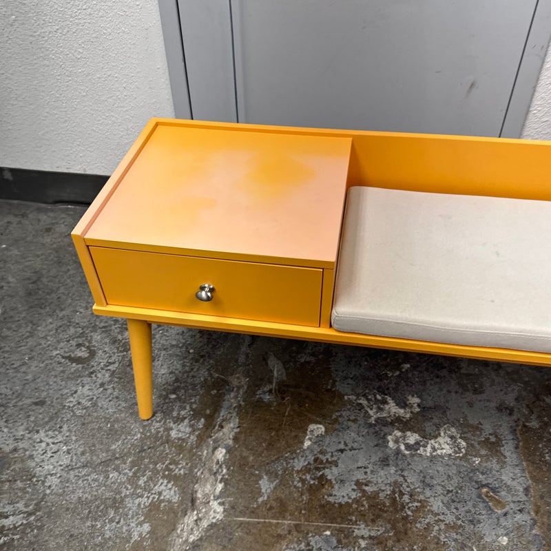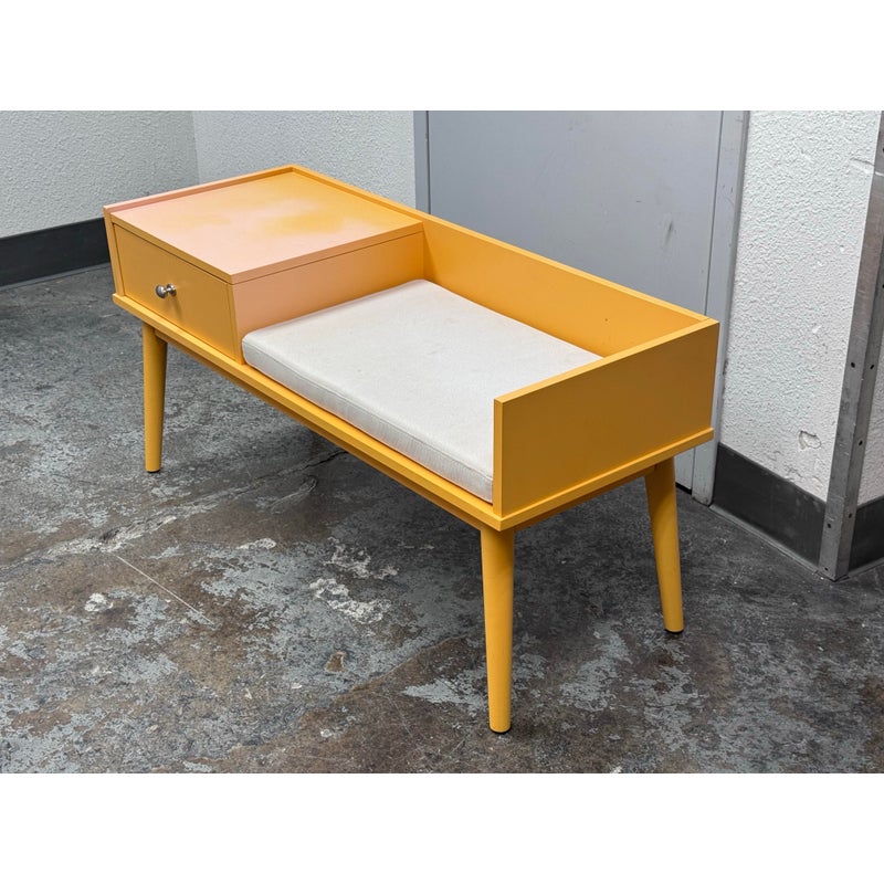 Design Plus Gallery presents a Storage Bench in Yellow from Hartnett. Functional and style to your foyer, entryway, hallway, or mud-room with this bench. Inspired by mid-century era style, this piece features sleek lines and tapered legs while staying relevant to contemporary design trends. Conveniently sit on the cushioned seat to put on shoes while the spacious drawer stores keys, magazines, hats, gloves, or other items away and out of sight. Surface damage to the finish gives the table an ombre effect.