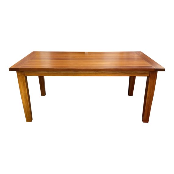 Design Plus Gallery presents a Harvest Home Solid Wood Extension Table. Beautiful oak wood has a red stain and a satin finish. Solid planks of wood have been constructed with mortise and tenon details. Comes with two additional leaves, one for each end. Minor wear on surfaces.