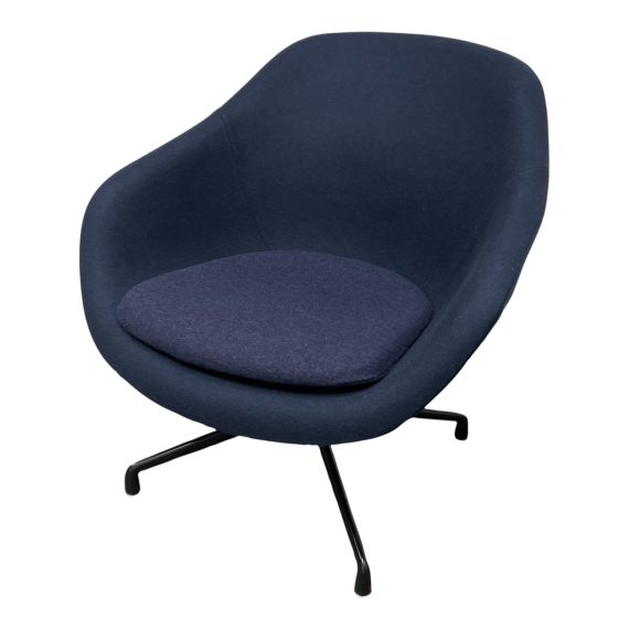 Design Plus Gallery presents a “About A” Lounge 81 Swivel Chair by Hay. Designed by Hee Welling. Offers a refreshingly pared back expression that matches the functional simplicity of the series. This compact lounge chair features clean lines with a sculpted design, shaped armrests, and a low back. The base is a metal swivel frame. Maharam Beck Upholstery in Letterpress blue, Seat cushion upholstery is slightly different blue. Minor wear from usage.
