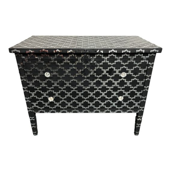 Design Plus Gallery presents a Wood + Mirror Two-Drawer Dresser by HD Buttercup. Constructed with wood and given a black finish. Besides the back, all surfaces are covered with mirror pieces arranged in a geometric pattern. The legs are square with no taper. The drawers have double glass knob pulls. Minor wear consistent with use; dresser is in good condition.