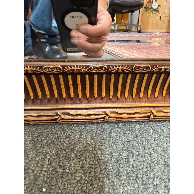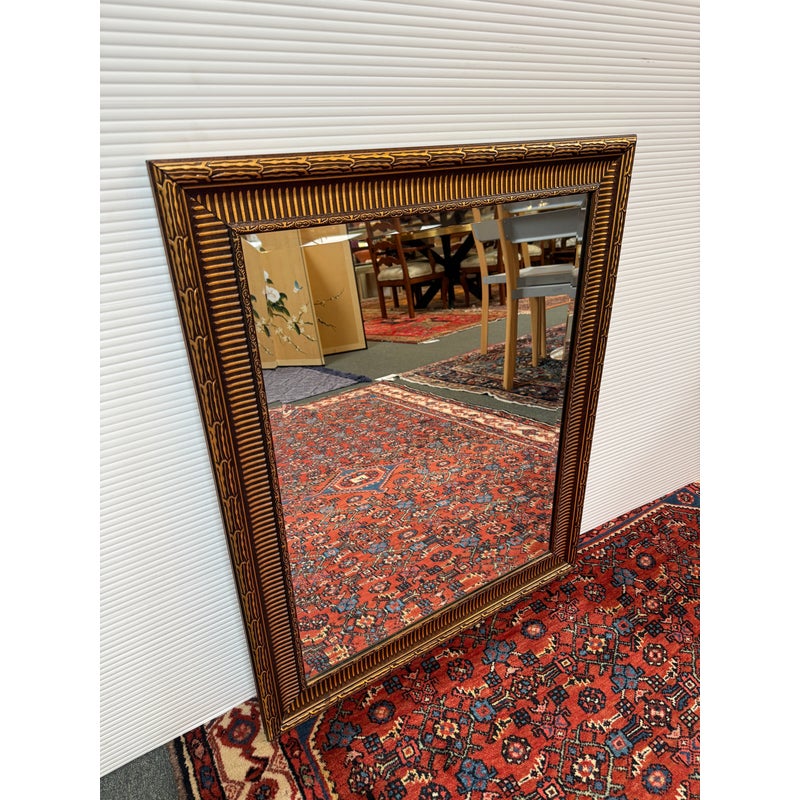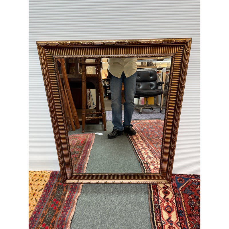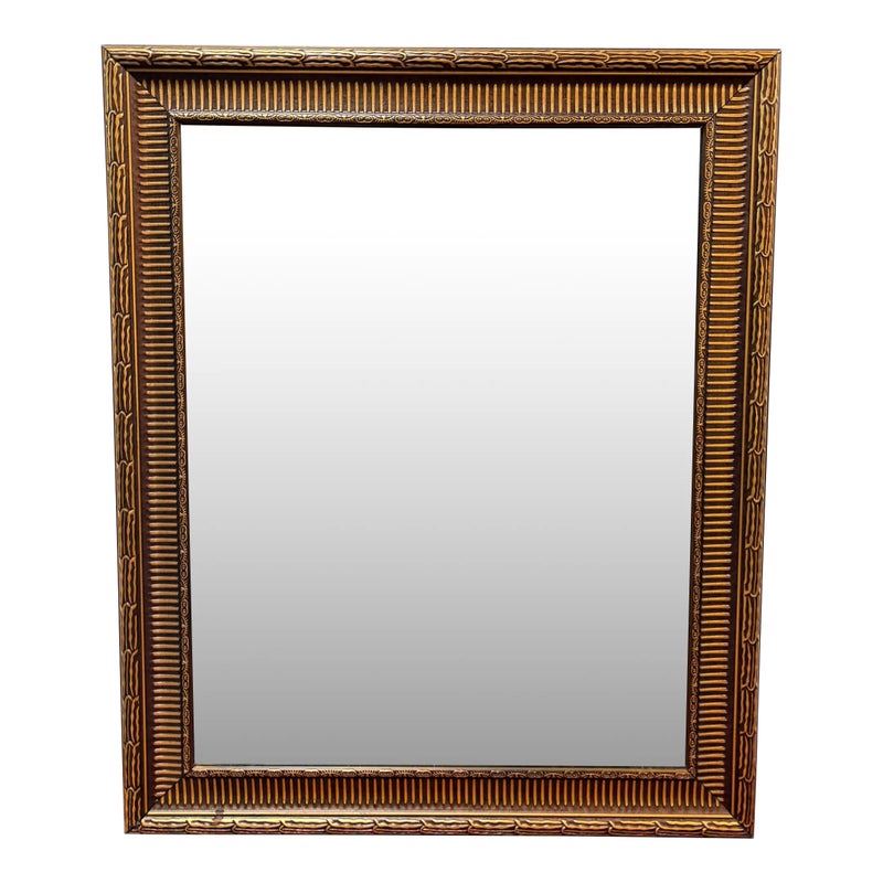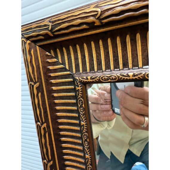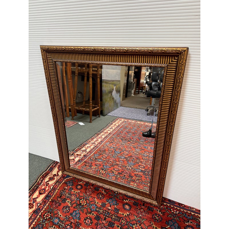Design Plus Galley presents a Texturized Wood Framed Mirror. The mirror is a dark wood with yellow tinted finish to the carvings. There are three layers of different patterns and sizes; the outside being the the second widest with the inside being widest, and thinnest is closest to the mirror itself. The mirror is in good condition on its from twitch some tearing to the paper back side.