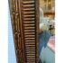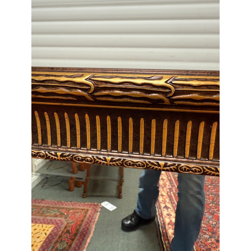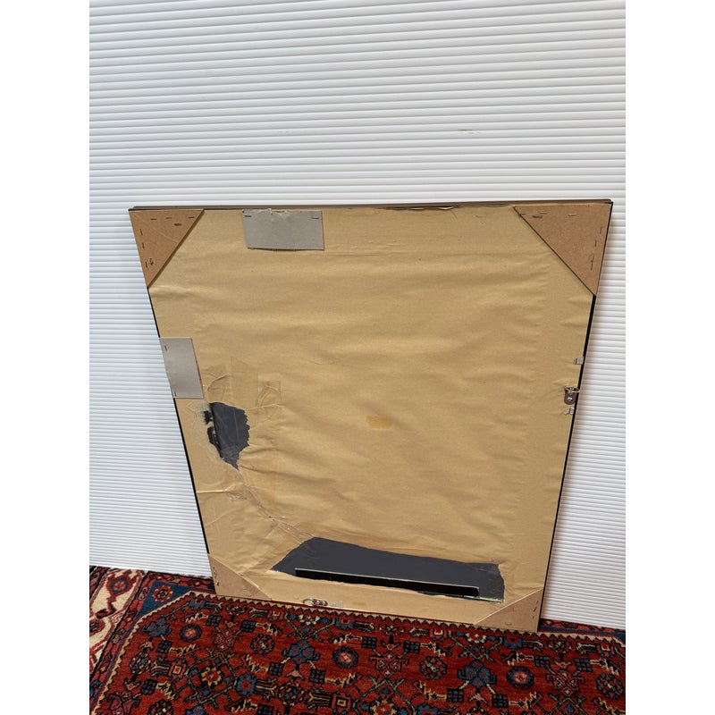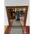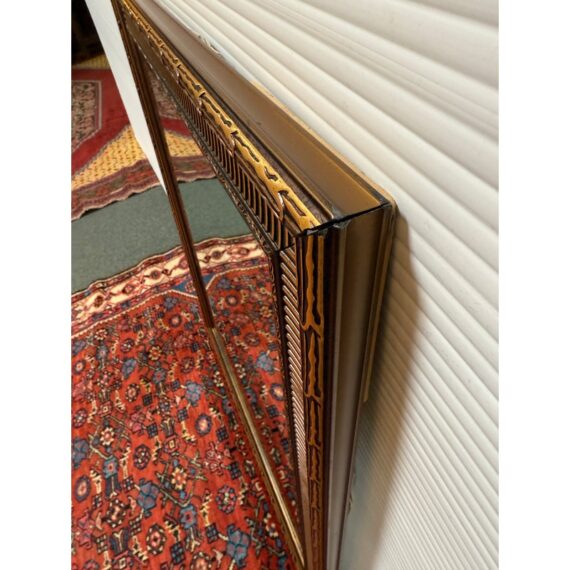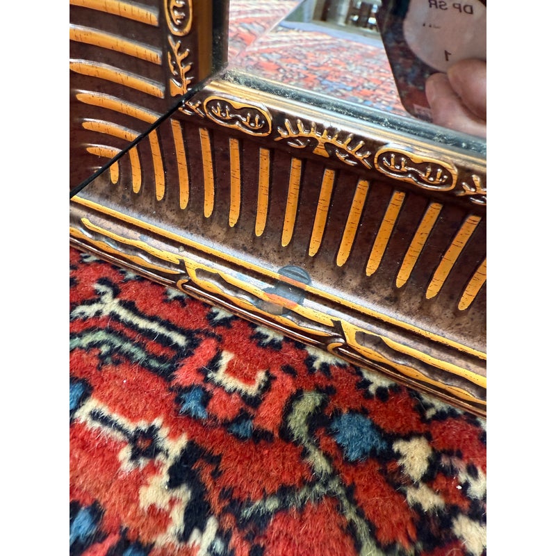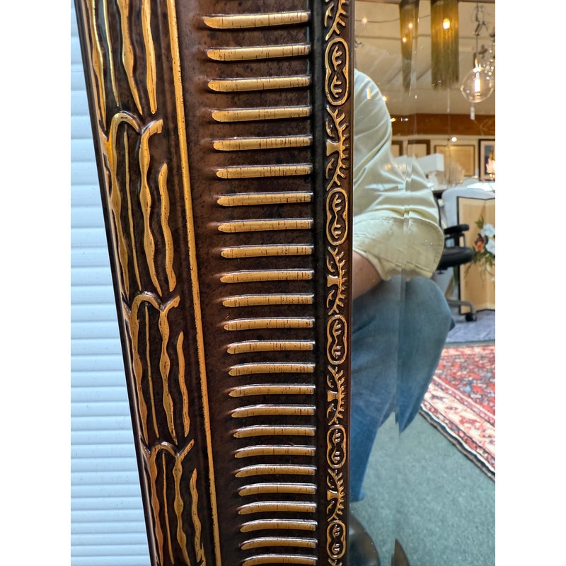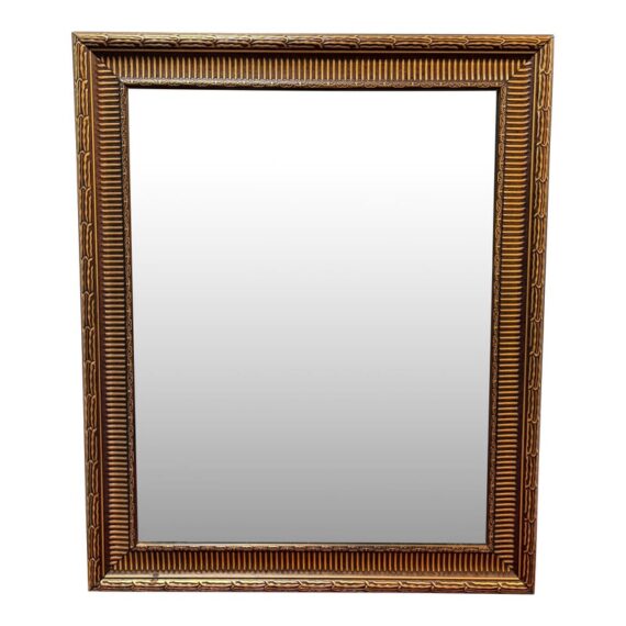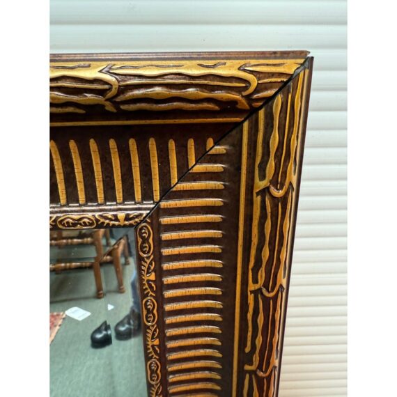 Design Plus Galley presents a Texturized Wood Framed Mirror. The mirror is a dark wood with yellow tinted finish to the carvings. There are three layers of different patterns and sizes; the outside being the the second widest with the inside being widest, and thinnest is closest to the mirror itself. The mirror is in good condition on its from twitch some tearing to the paper back side.
