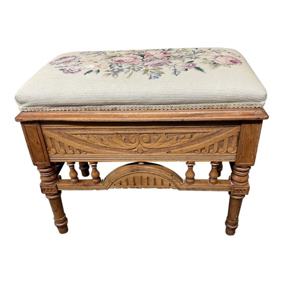 Design Plus Gallery presents an Antique Eastlake Footstool. Although intricately embellished, Eastlake is relatively simple in comparison to the Victorain era that preceded it. Hallmarks of English Architect Charles Eastlake design in furniture is handcrafted solid wood, lovely carved and turned elements, carved bits of nature which are represented in this elegant footstool. Cushioned floral needlepoint top hinges open to reveal a roomy storage cubby. This piece has been cared for by a single family since its hand-crafting. Little evidence of wear; good condition.